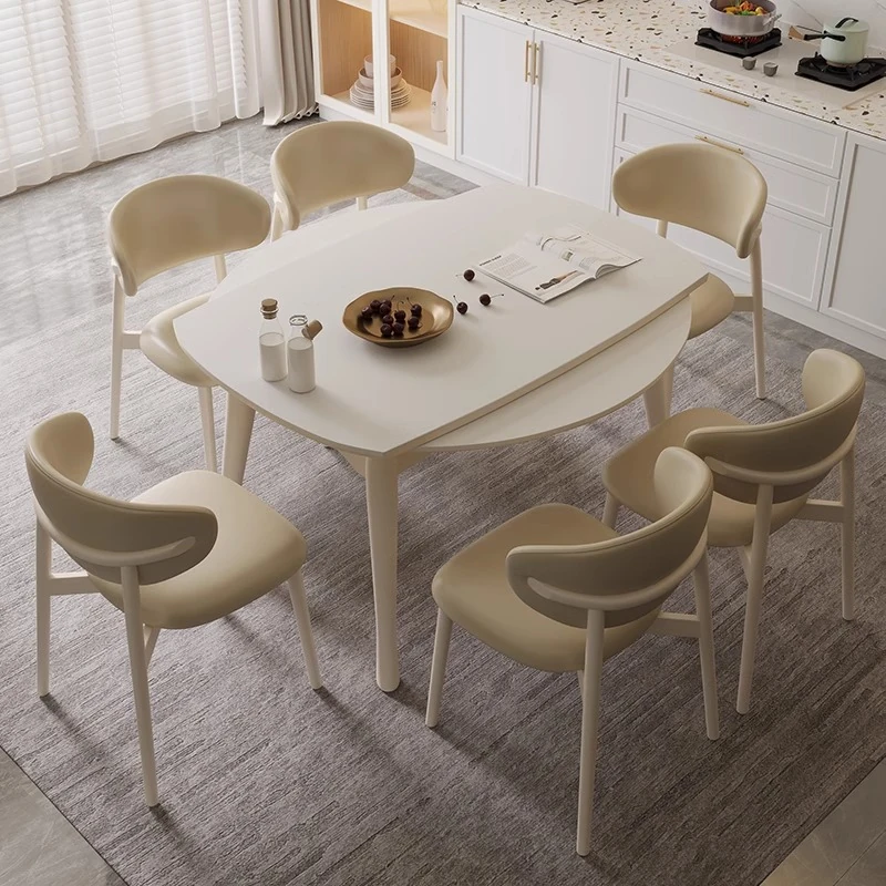 オシャレで機能的な折りたたみ伸縮式岩板ダイニングテーブル|小型住宅に最適な現代的シンプル軽奢スタイル|クリーム風のスクエア&ラウンド両用デザイン