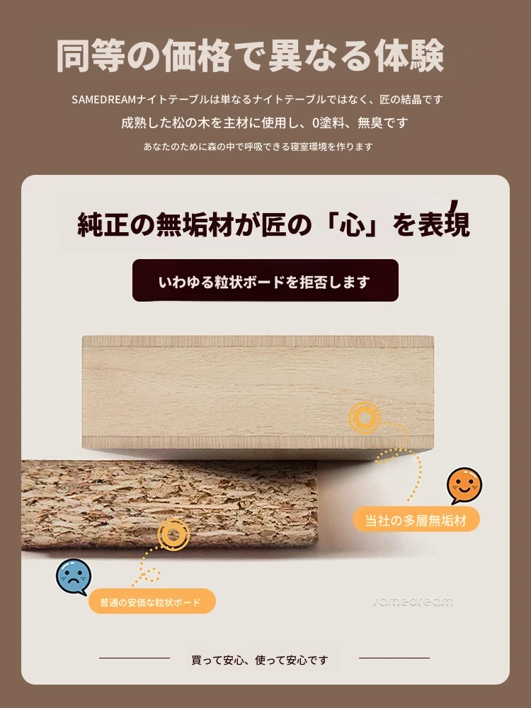 三夢の天然木製ナイトテーブル2025年新作!シンプルでモダンなデザイン、軽やかなラグジュアリー感が漂う。コンパクトサイズで、寝室のスペースを有効活用。収納力も抜群で、あなたのライフスタイルをより快適に!
