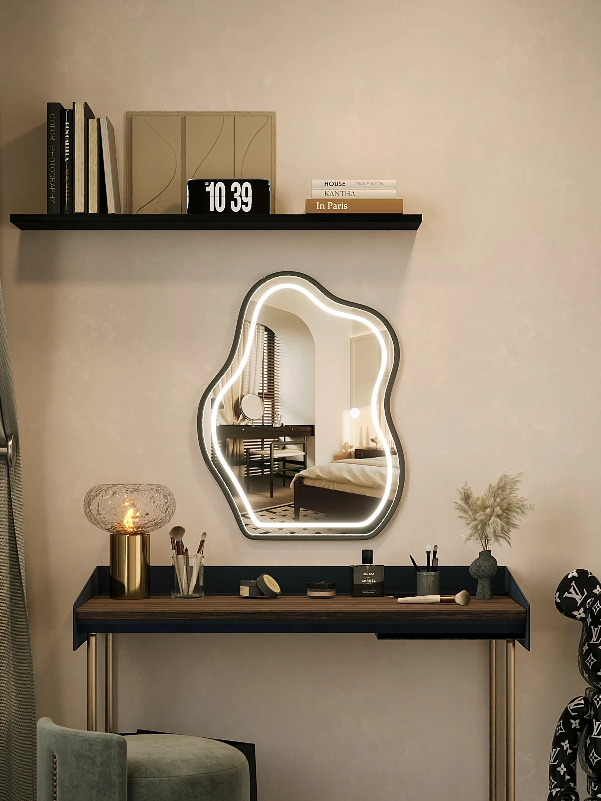 異形デザインの卓上化粧鏡 LEDライト付き!高級感あふれるスマートミラーで、主寝室のメイクアップを華やかに。おしゃれで機能的なアイテムで、毎日のビューティータイムを特別なものに。