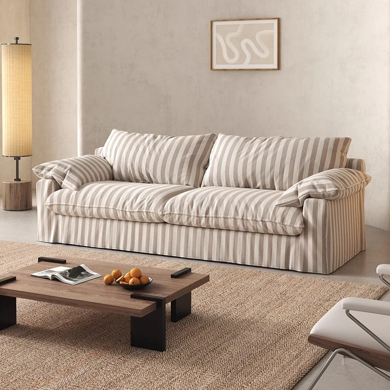 Yunxin Embrace Sofa - Wabi-Sabi Style Striped Linen Fabric, Fully Removable and Washable, French Cream Straight-Line Down Sofa for Ultimate Comfort and Elegance