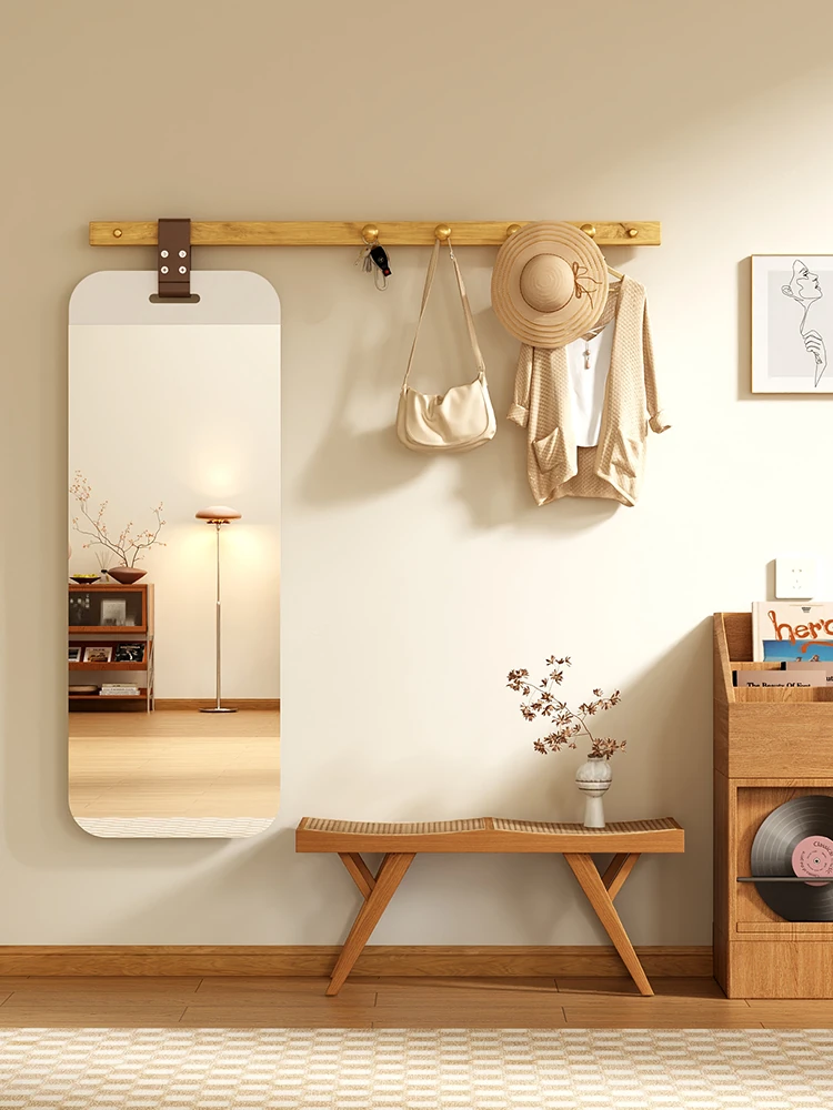 Sliding Full-Length Mirror with Hidden Design - Solid Wood Pegboard, Wall-Mounted, Space-Saving, Ideal for Home Use and Entryways, Perfect for Try-On Sessions.
