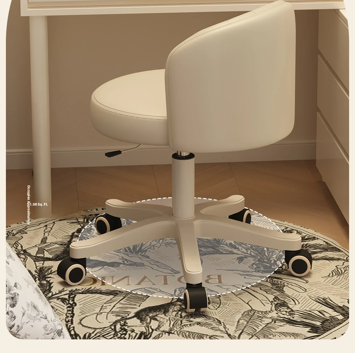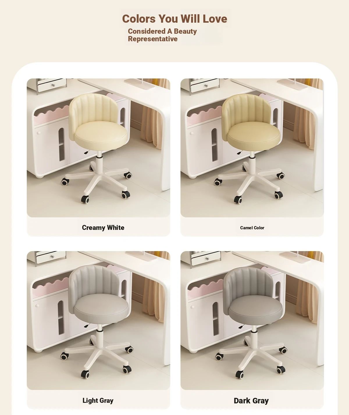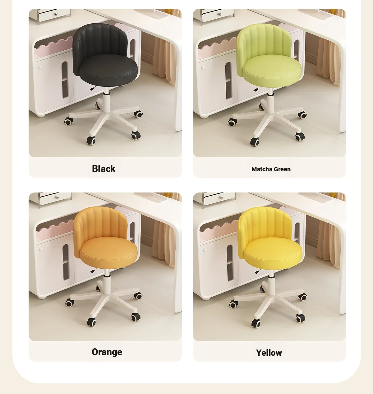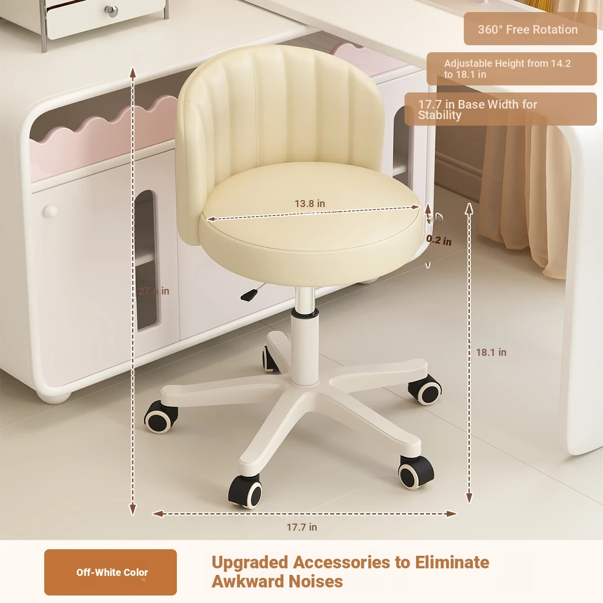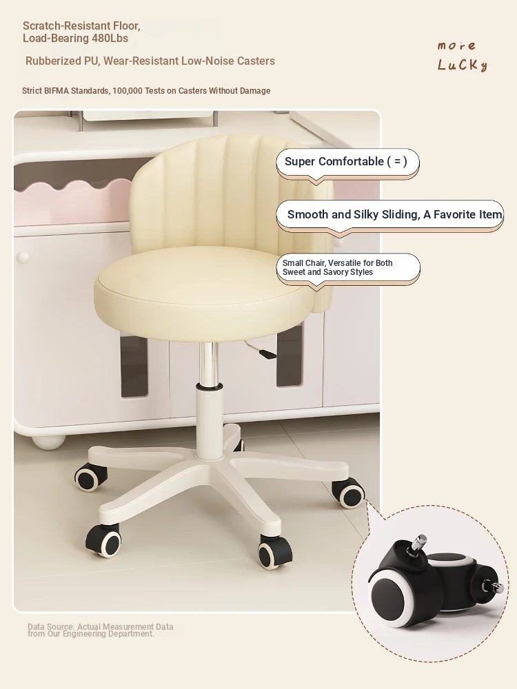 Creamy Makeup Chair for Girls - Stylish Bedroom Vanity Stool with Adjustable Backrest, Height and Swivel Wheels, Perfect for Beauty and Nail Art!