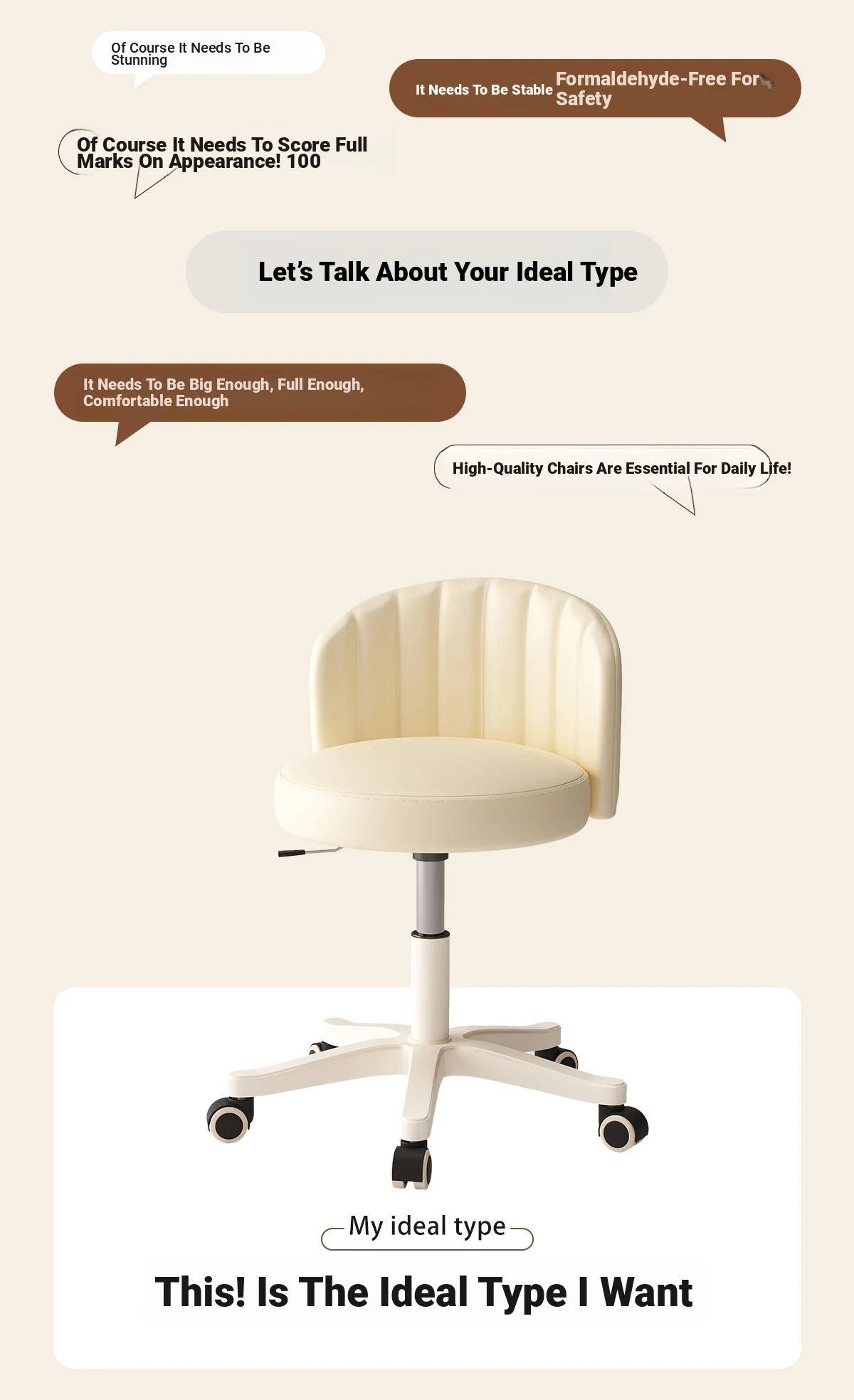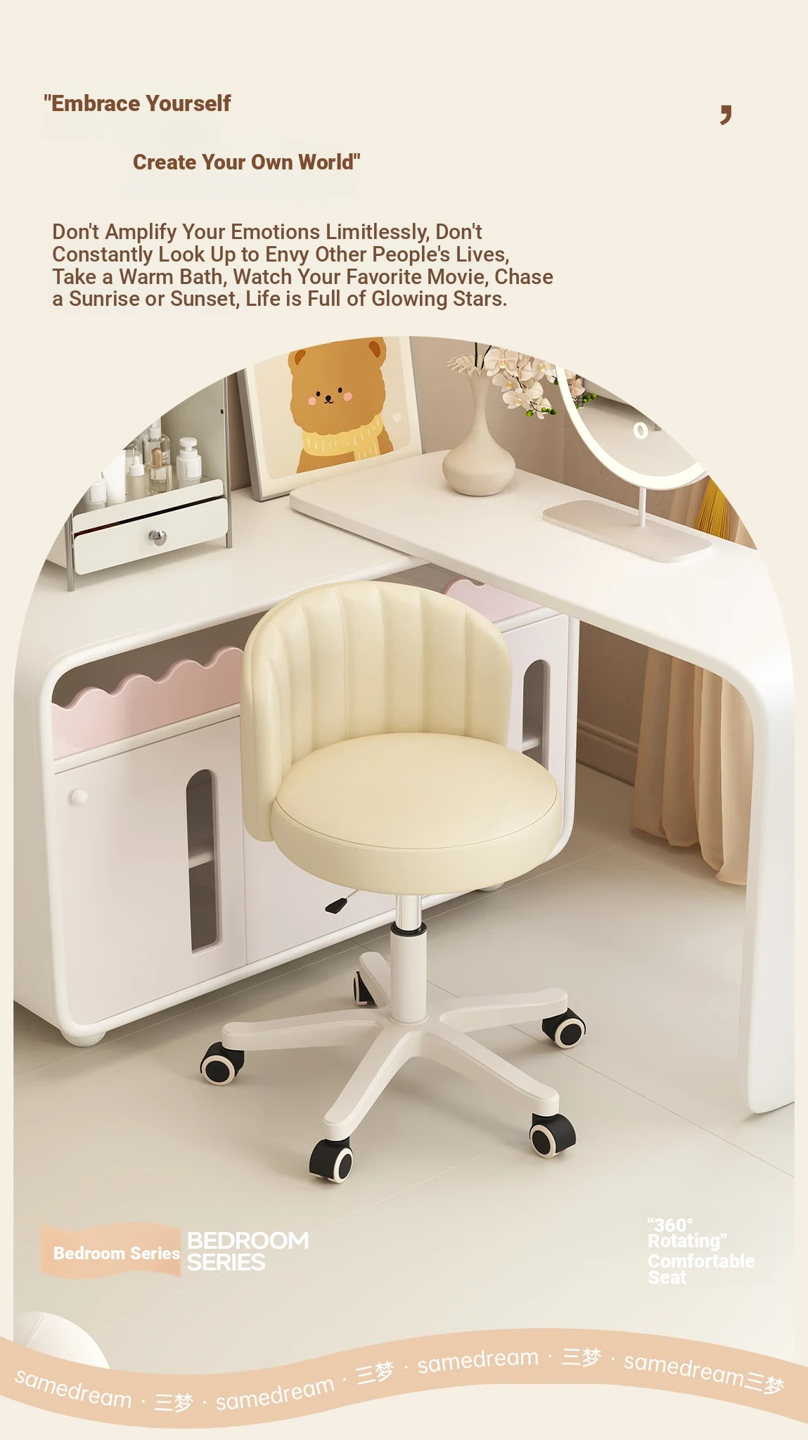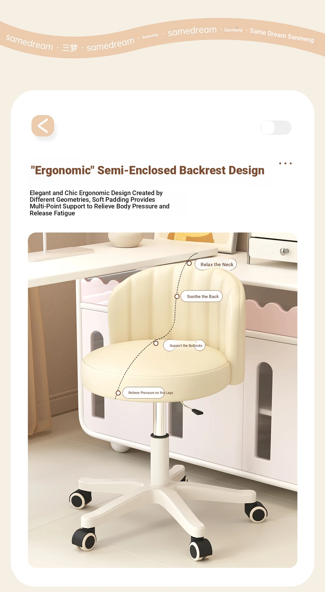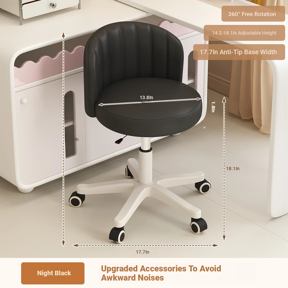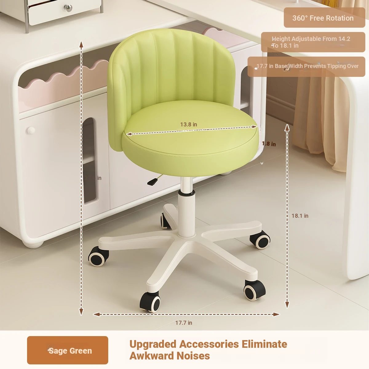 Creamy Makeup Chair for Girls - Stylish Bedroom Vanity Stool with Adjustable Backrest, Height and Swivel Wheels, Perfect for Beauty and Nail Art!