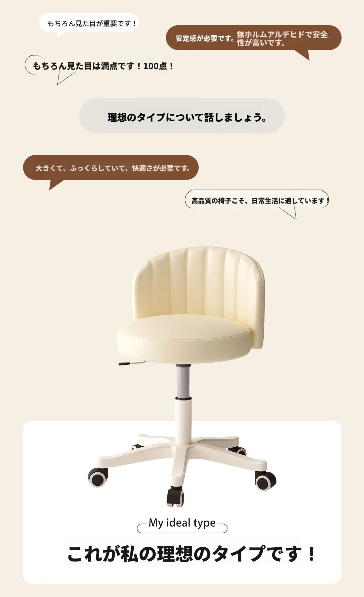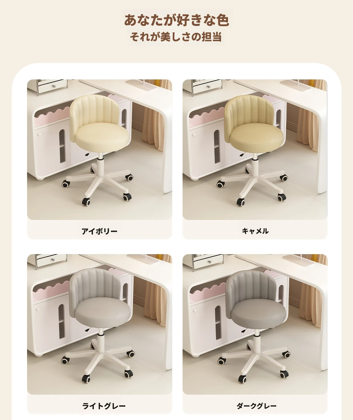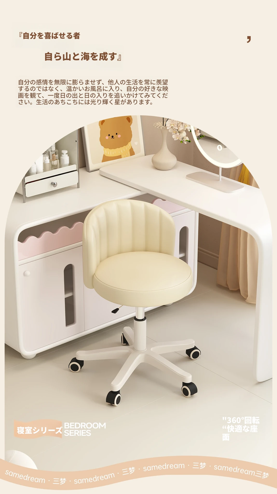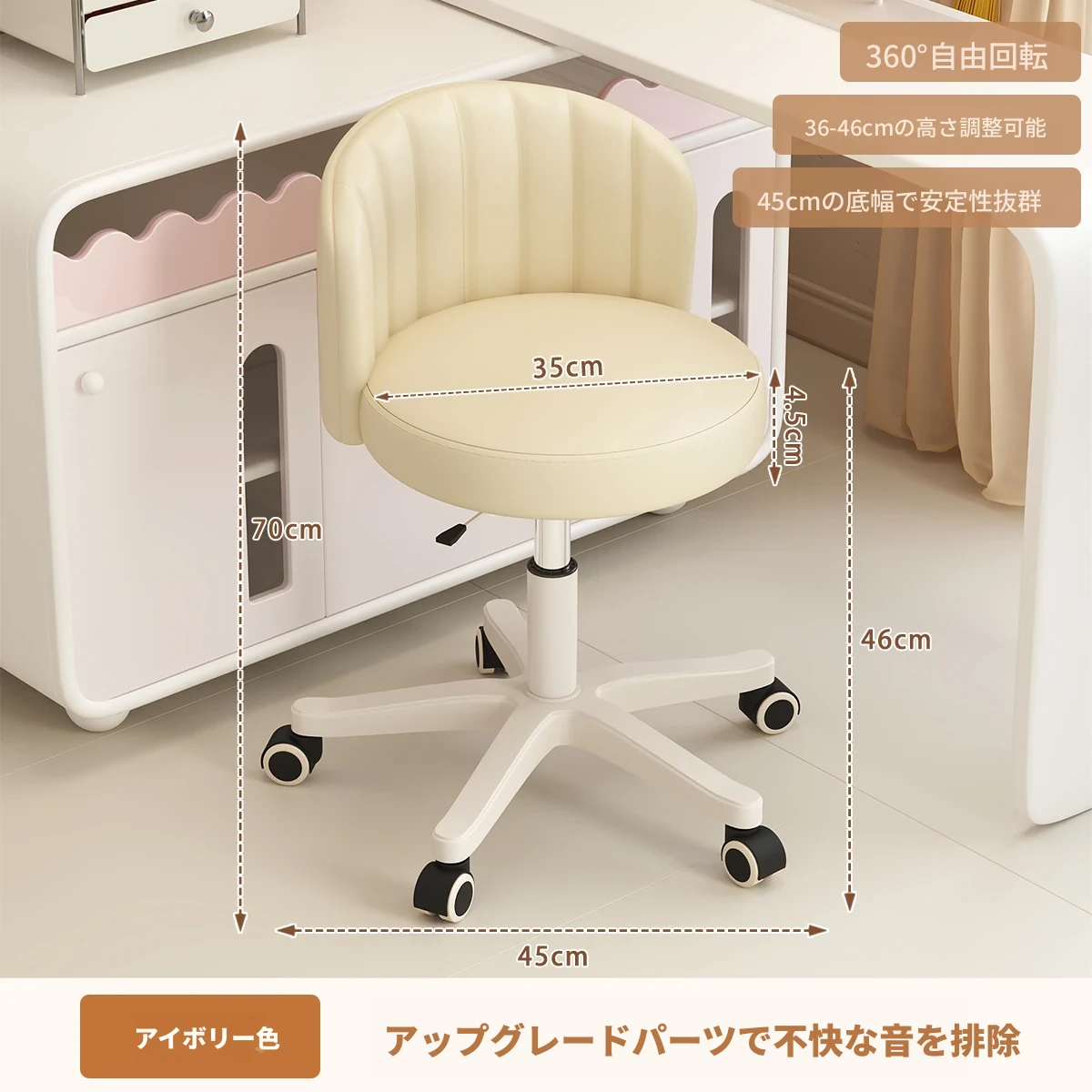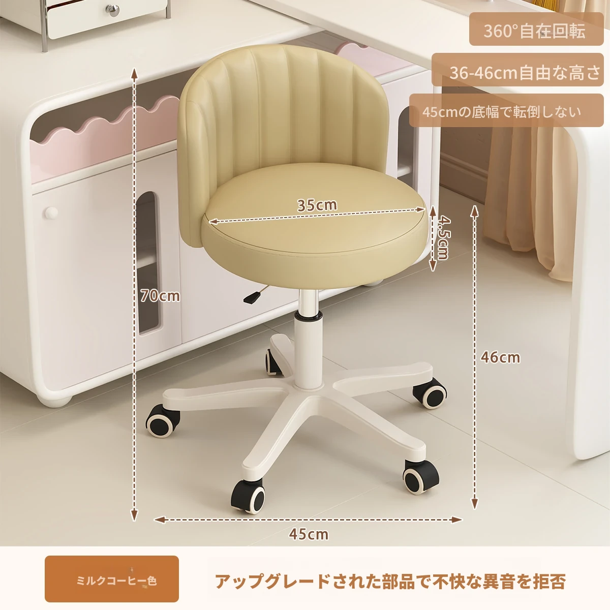 クリームカラーのメイクアップチェア - 女子の寝室にぴったり!調整可能な背もたれと回転機能付き、スムーズなキャスターで移動もラクラク。美容やネイル作業に最適なスタイリッシュなデザイン。