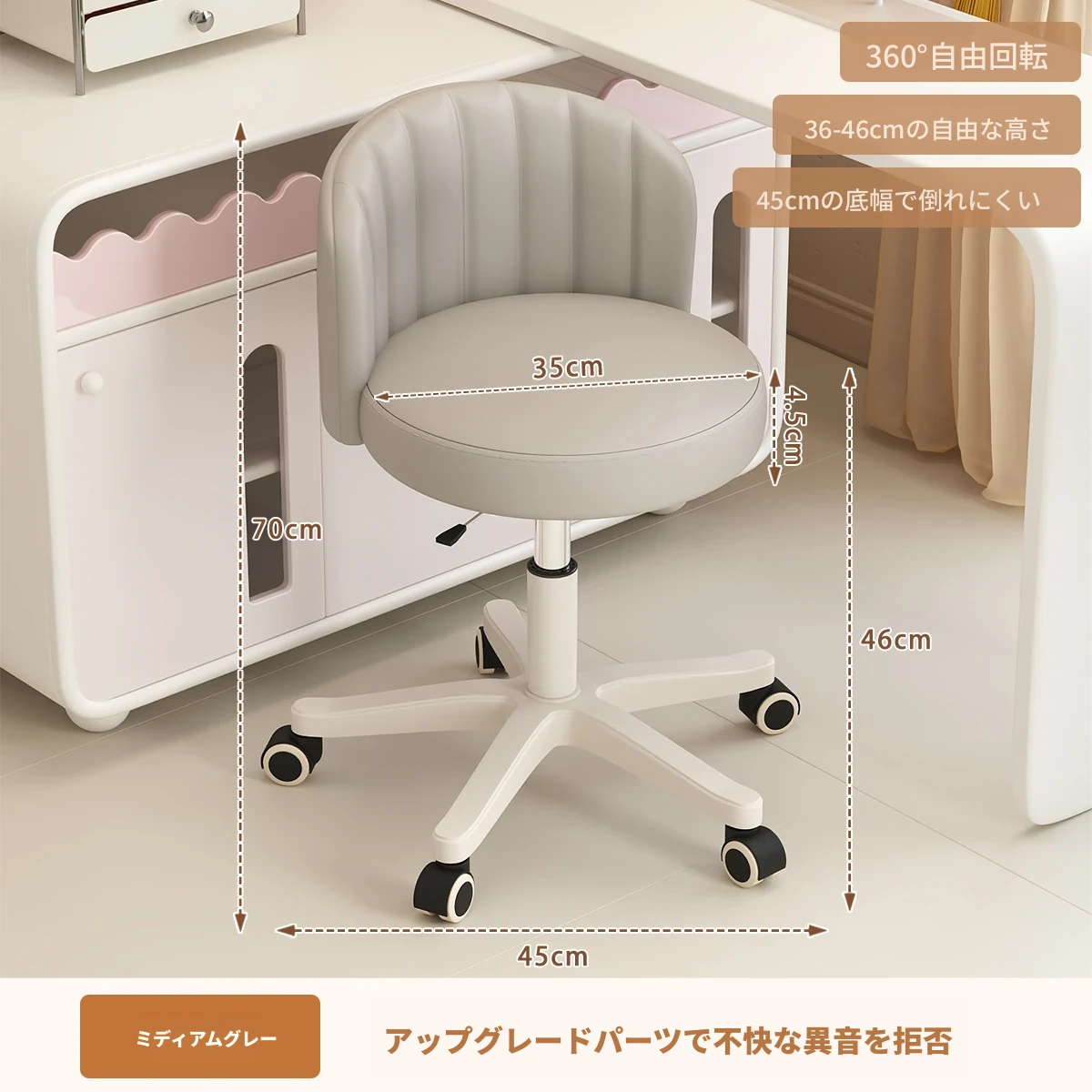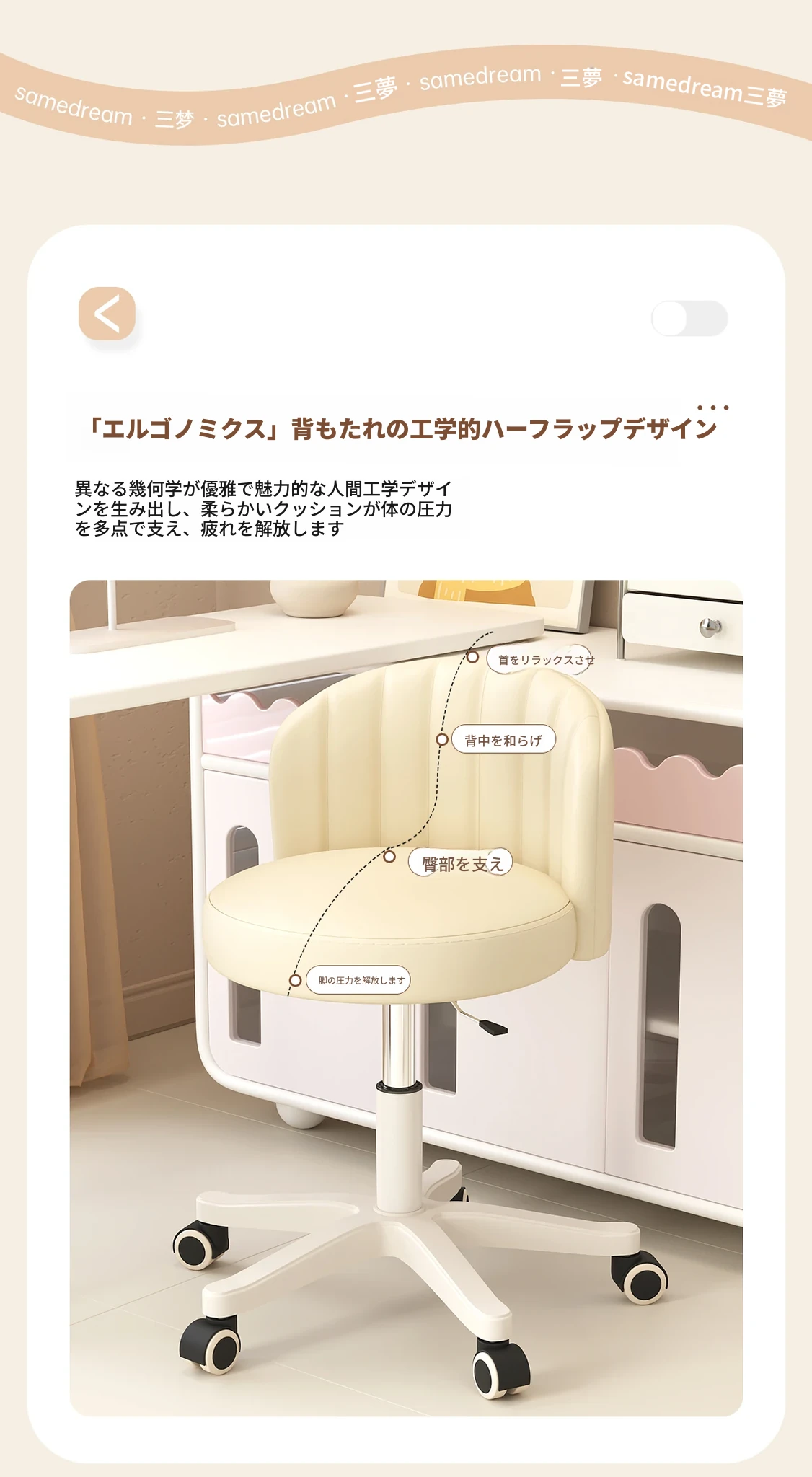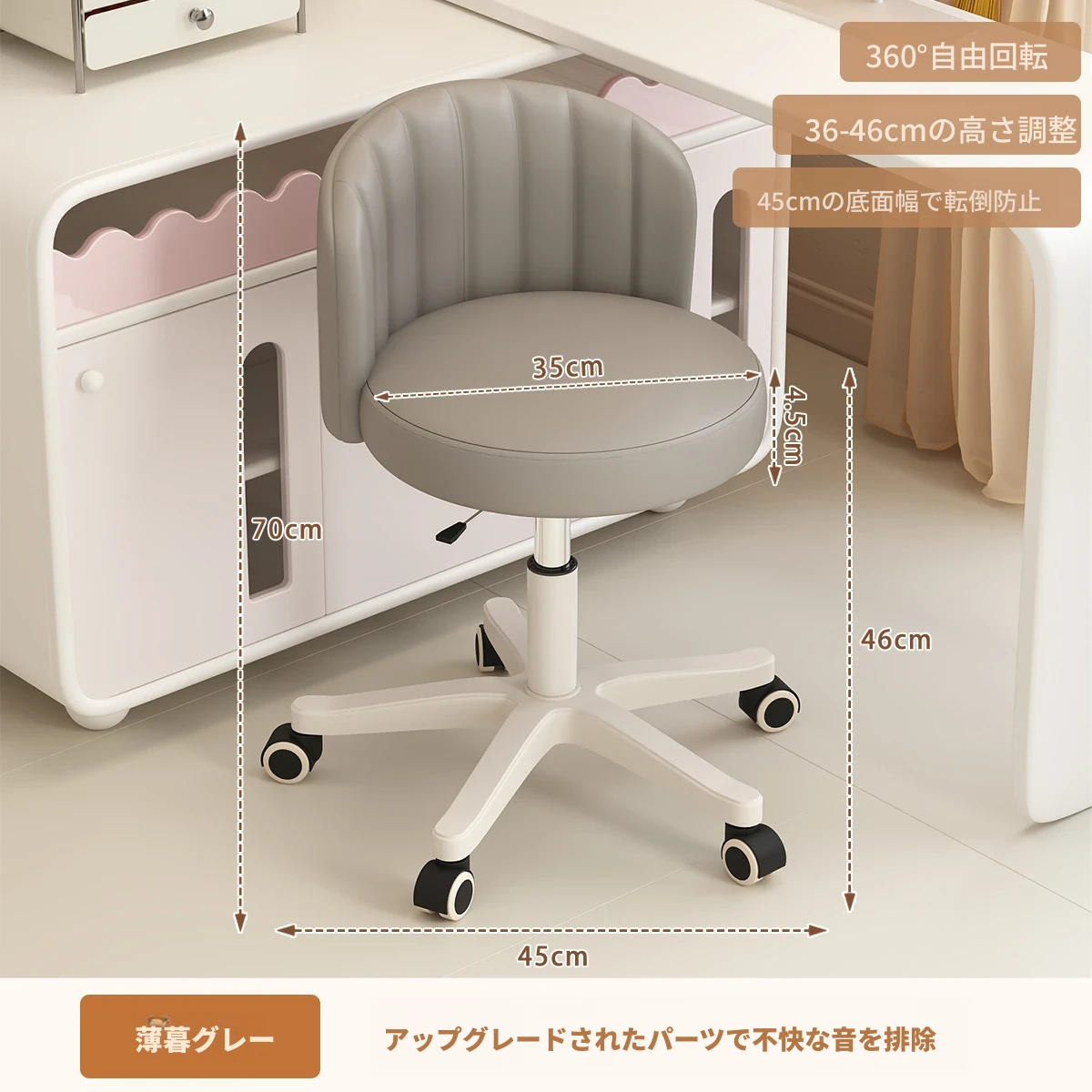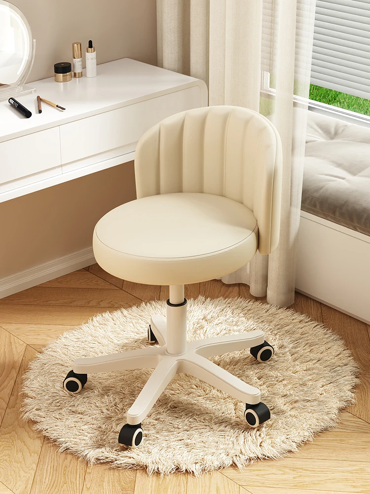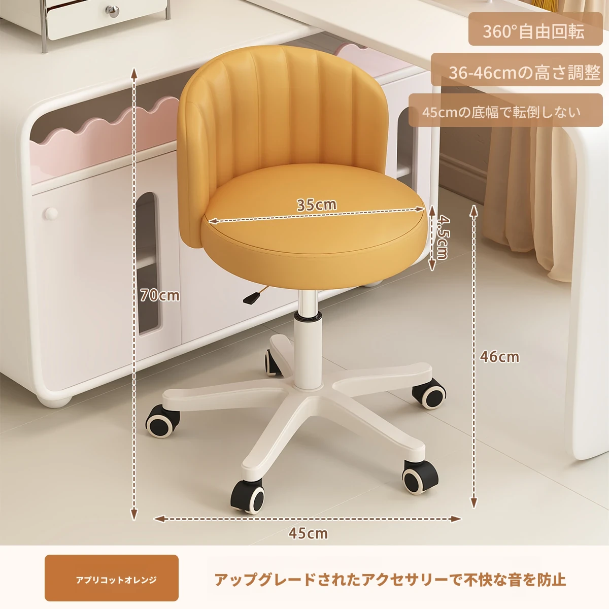 クリームカラーのメイクアップチェア - 女子の寝室にぴったり!調整可能な背もたれと回転機能付き、スムーズなキャスターで移動もラクラク。美容やネイル作業に最適なスタイリッシュなデザイン。