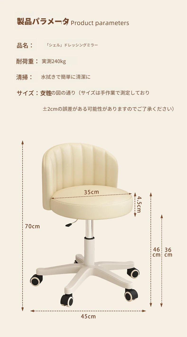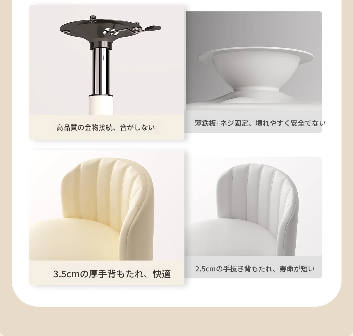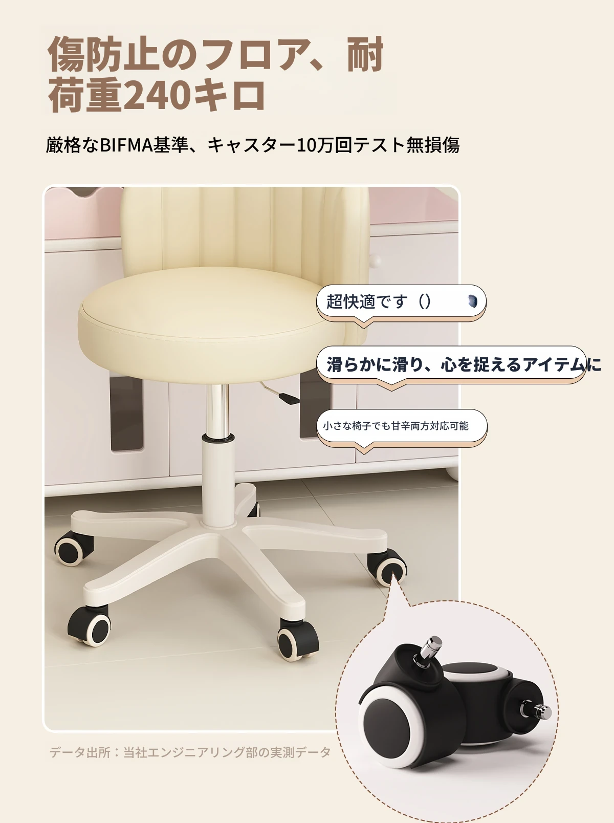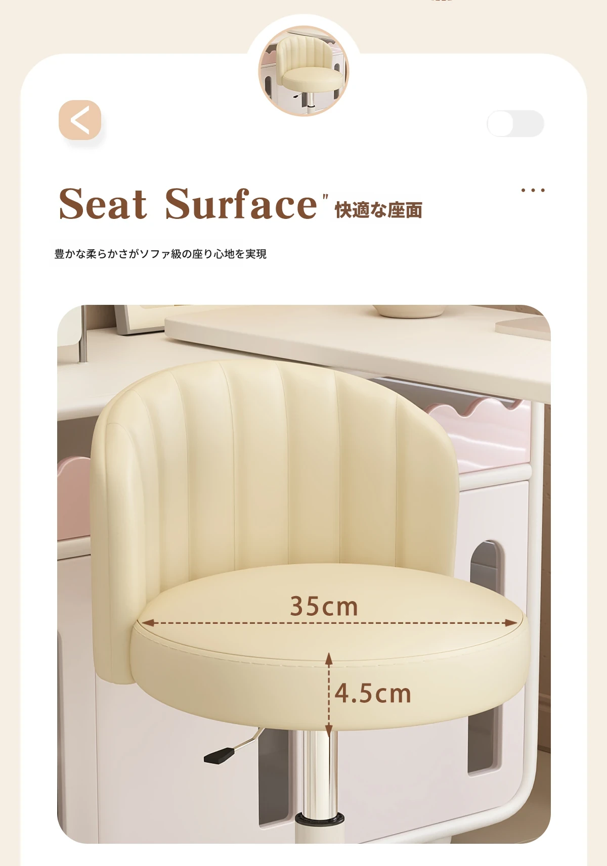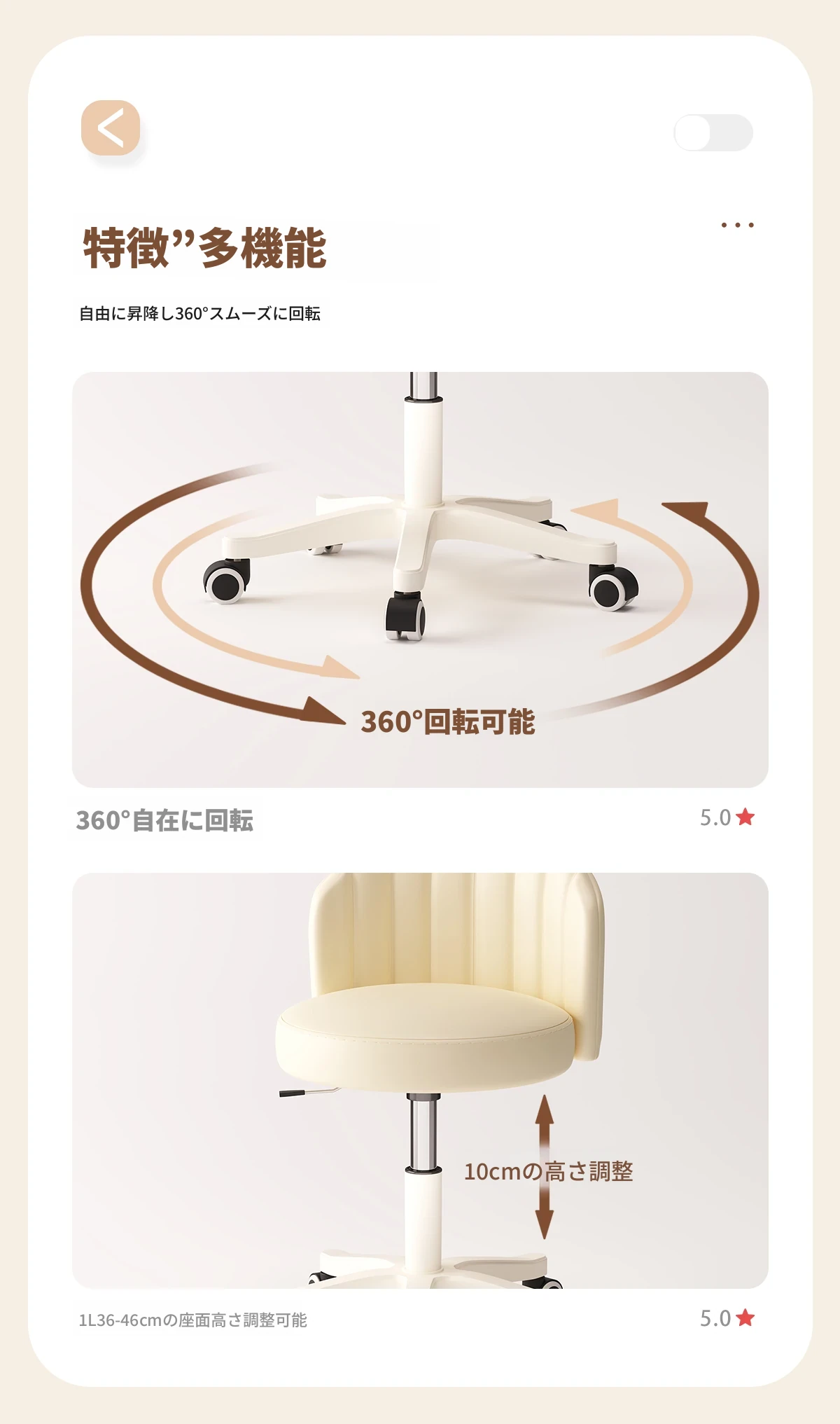 クリームカラーのメイクアップチェア - 女子の寝室にぴったり!調整可能な背もたれと回転機能付き、スムーズなキャスターで移動もラクラク。美容やネイル作業に最適なスタイリッシュなデザイン。