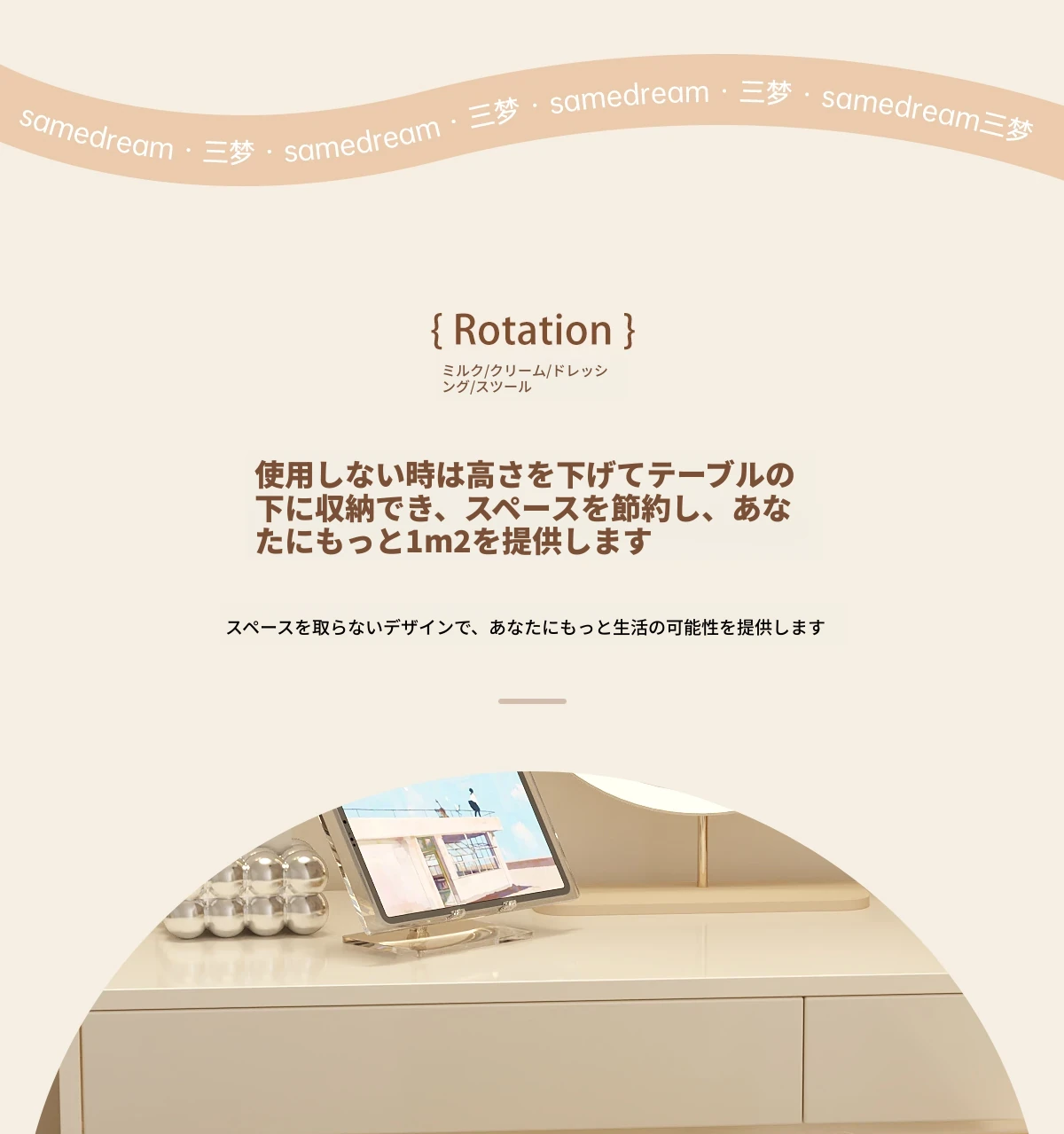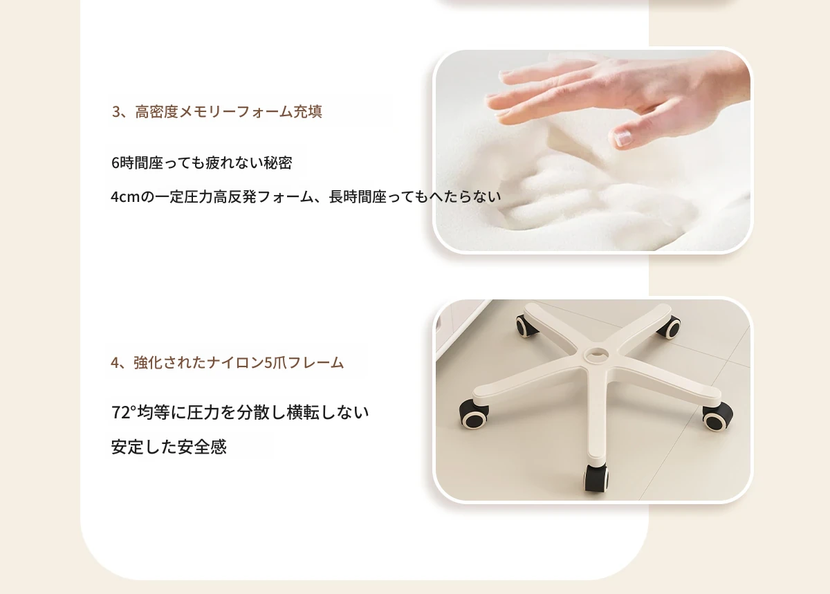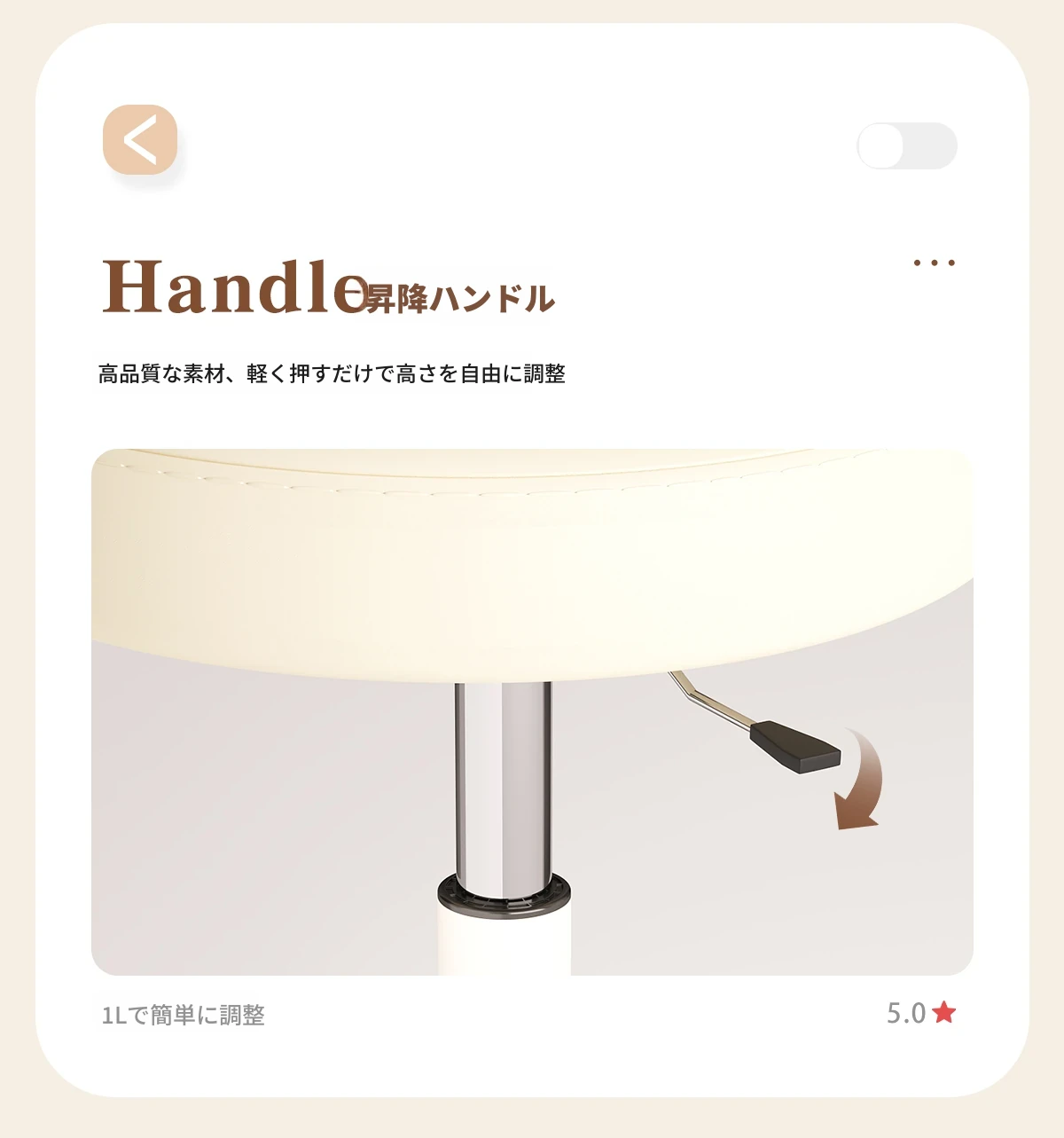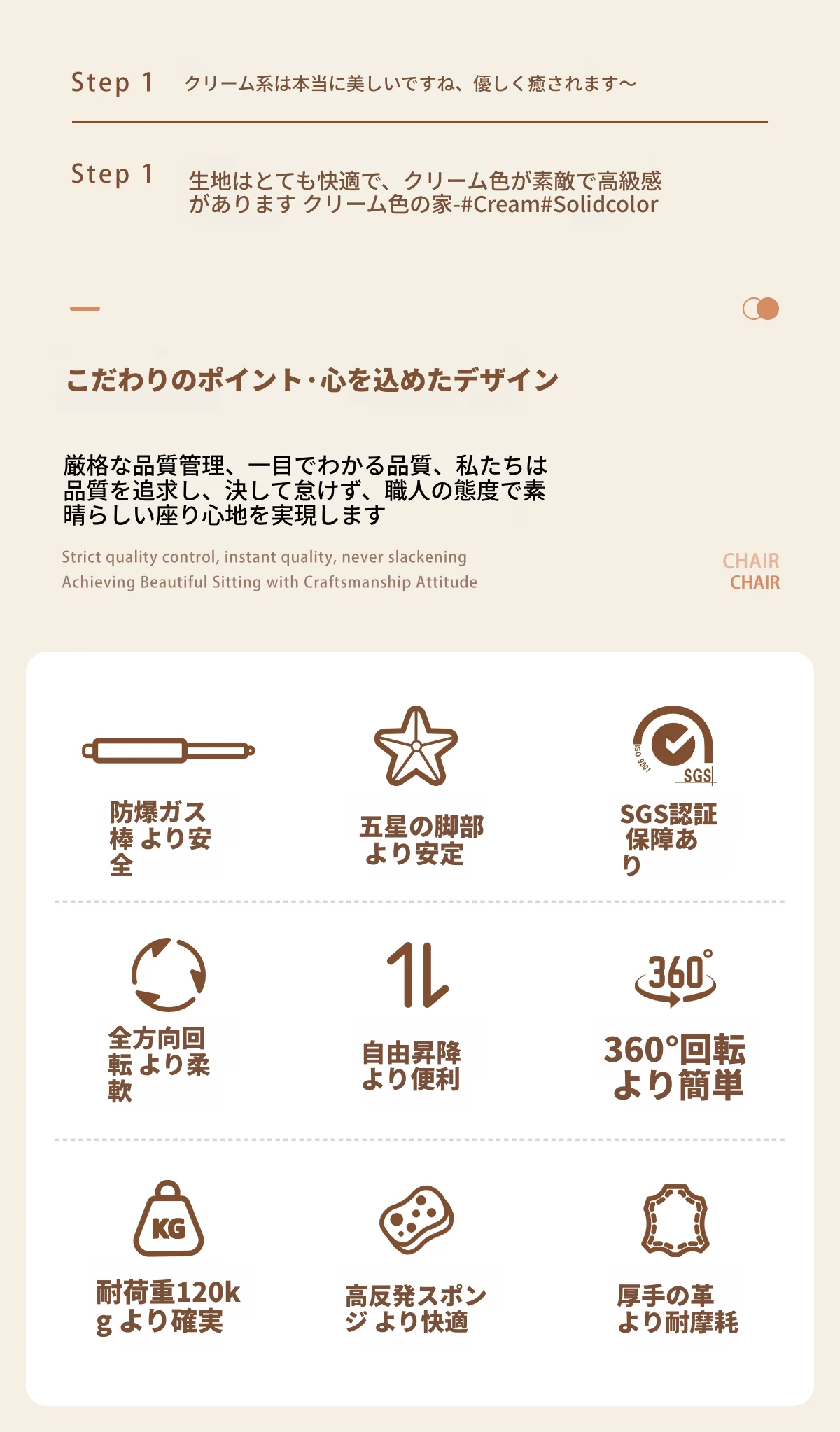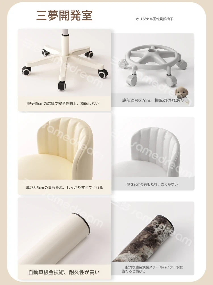 クリームカラーのメイクアップチェア - 女子の寝室にぴったり!調整可能な背もたれと回転機能付き、スムーズなキャスターで移動もラクラク。美容やネイル作業に最適なスタイリッシュなデザイン。