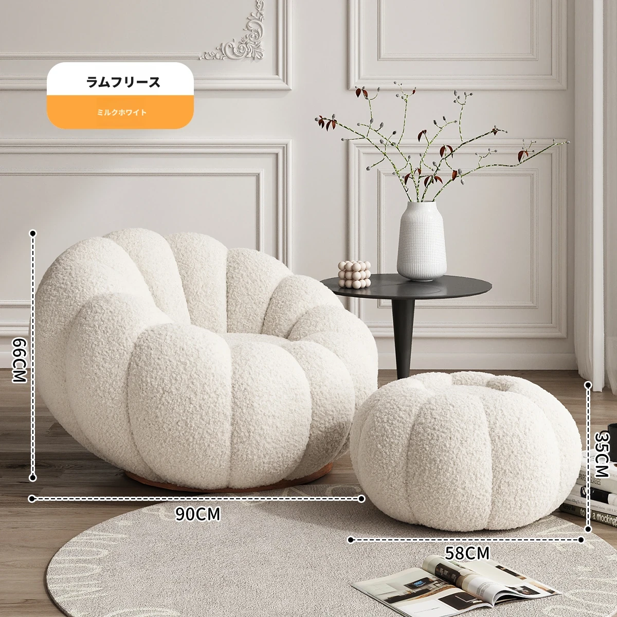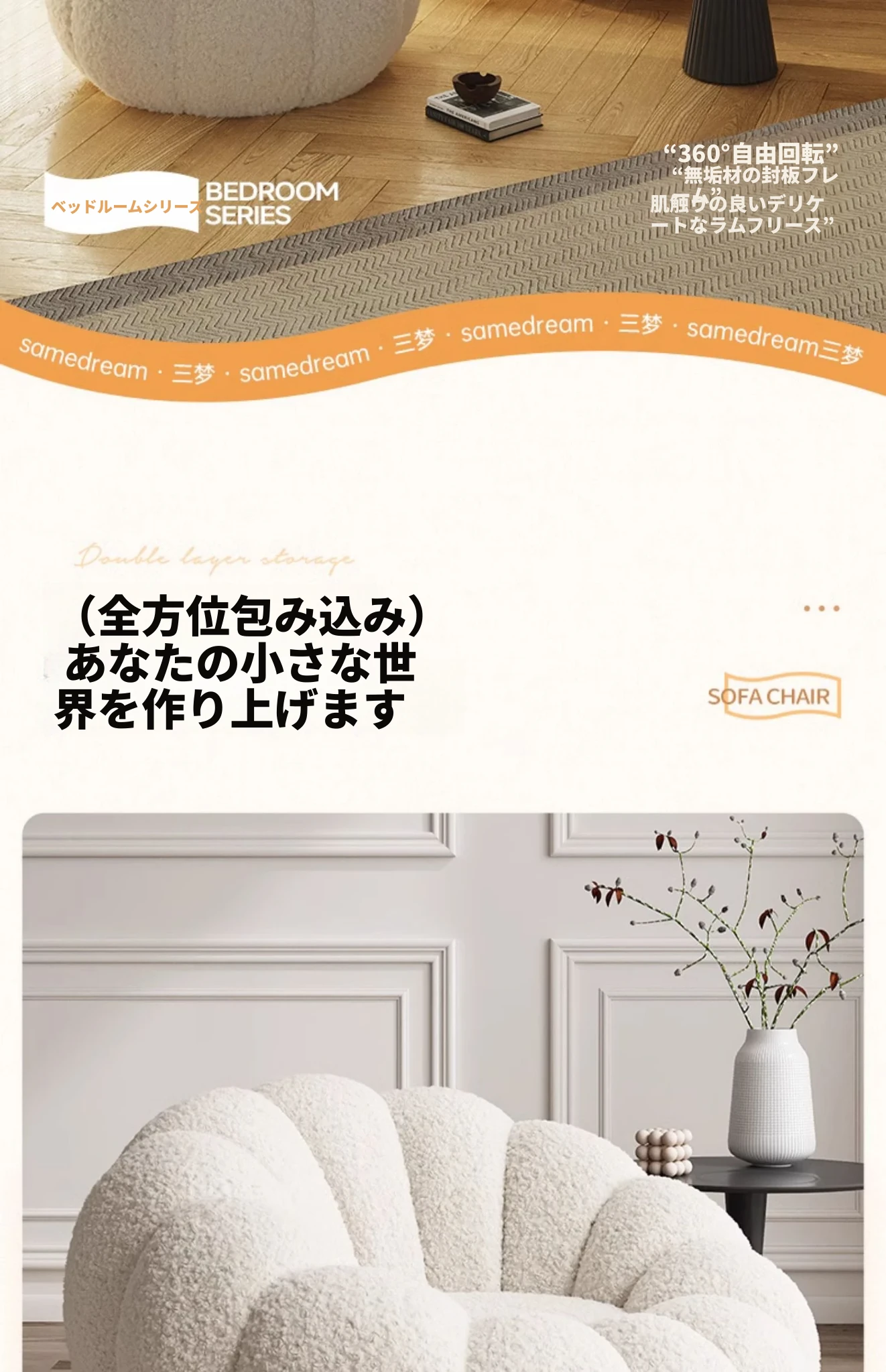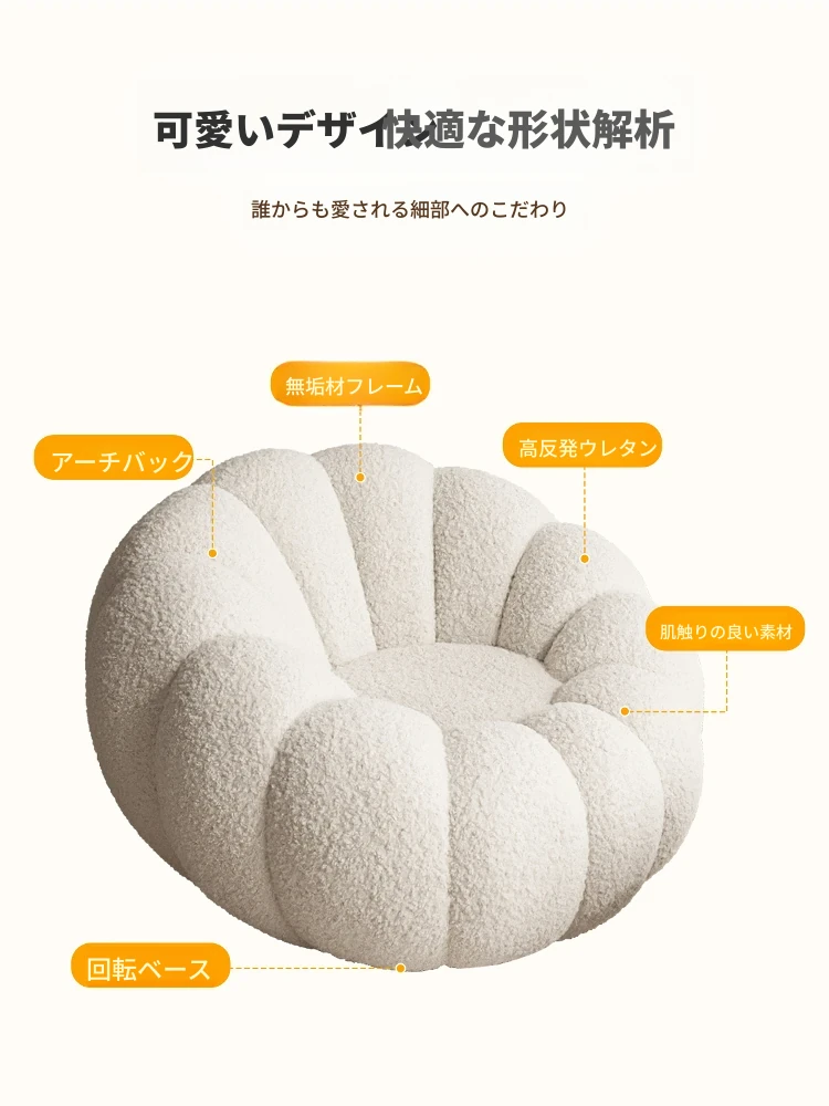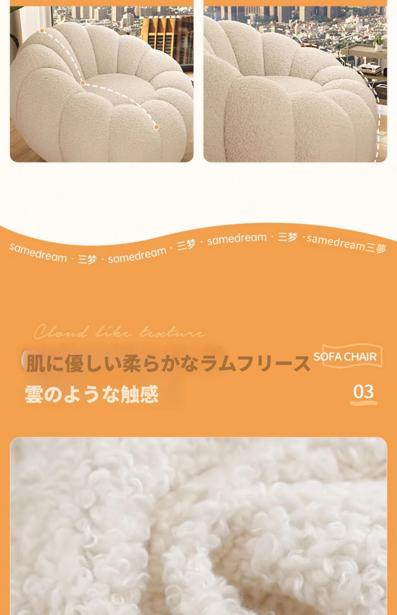 夢のようなリラックス!三夢のローソファは、寝転んだり、眠ったりできるクリーム色のカボチャ型回転椅子。リビング・寝室・バルコニーにぴったりの一人用「人間用犬小屋」です。快適さとスタイルを両立させた特別な空間をあなたに!