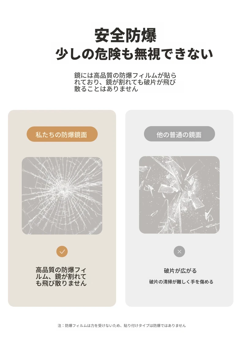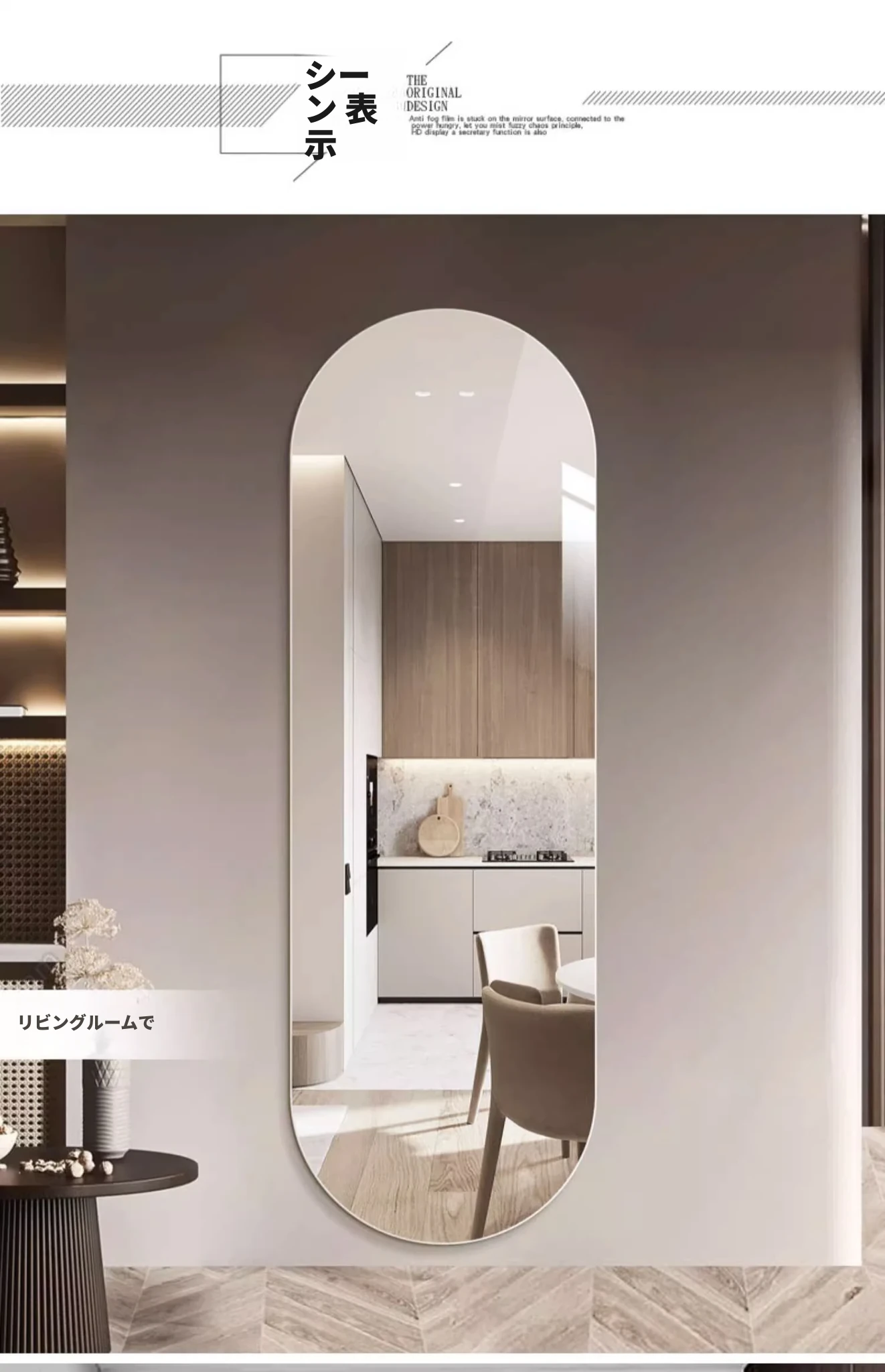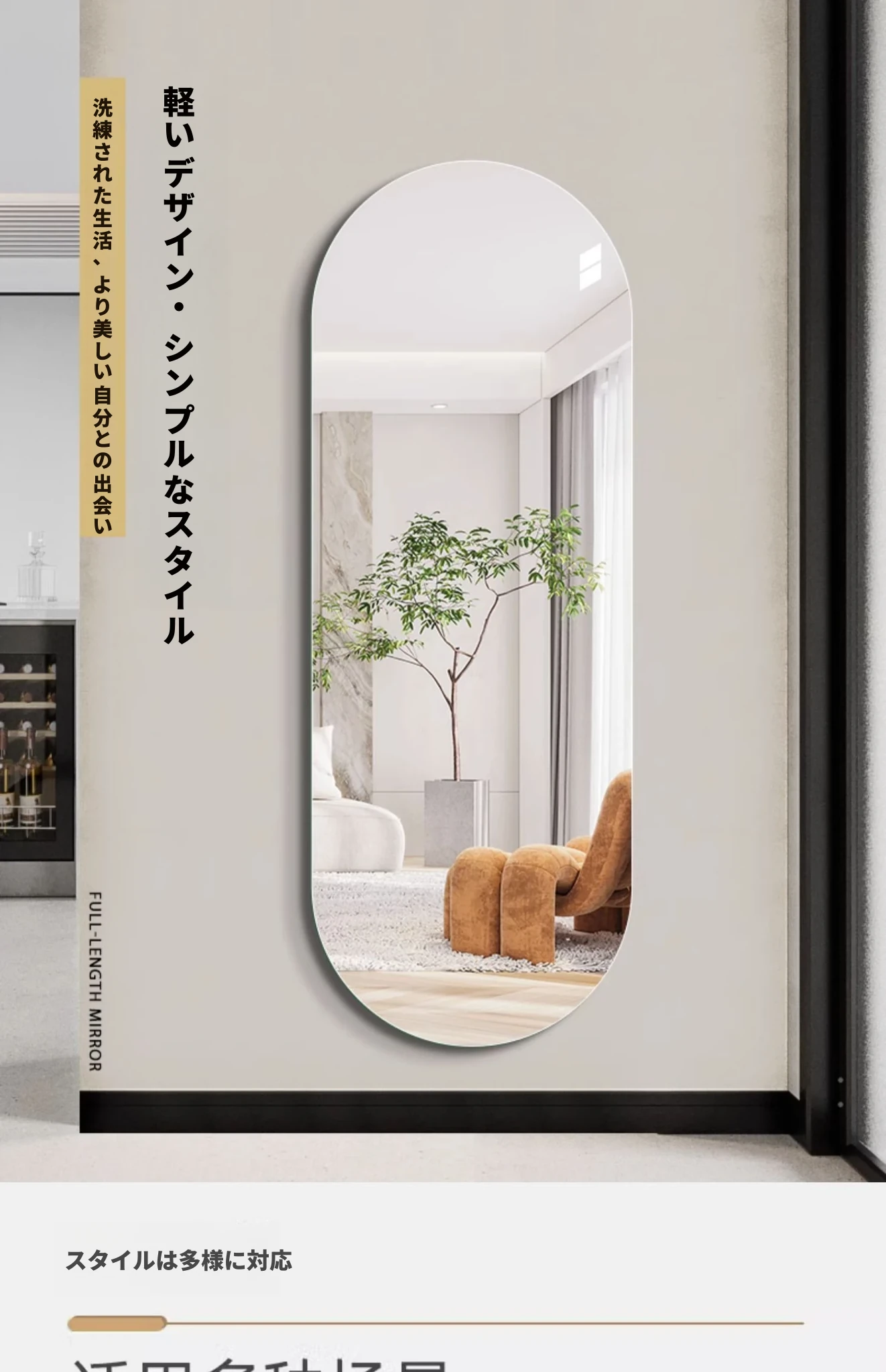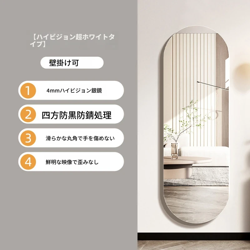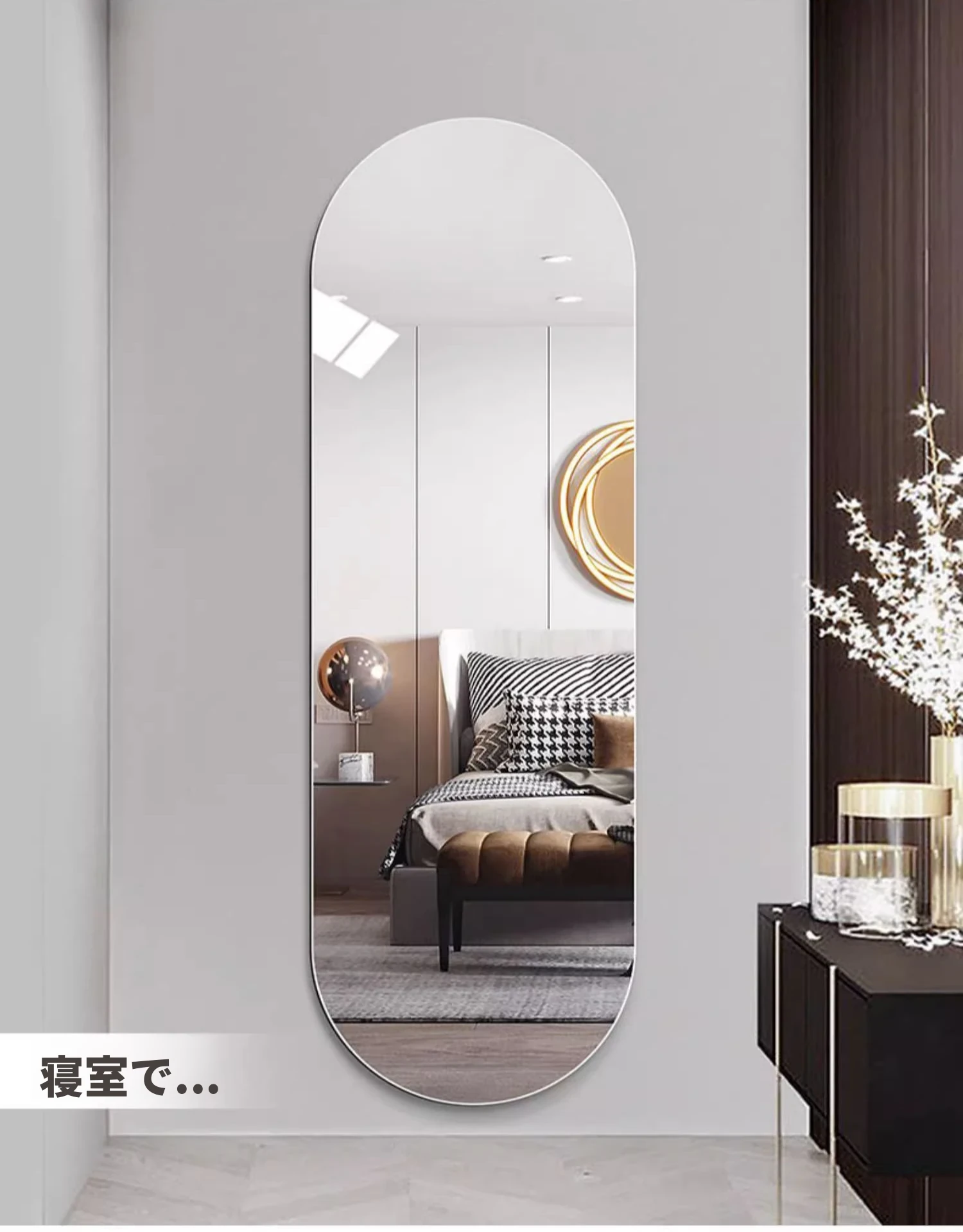スタイリッシュなフレームレス全身鏡!高級感漂う壁掛けミラーは、自宅のインテリアにぴったり。自己粘着で簡単取り付け、破損防止設計で安全性も抜群。おしゃれな試着スペースを実現します!
