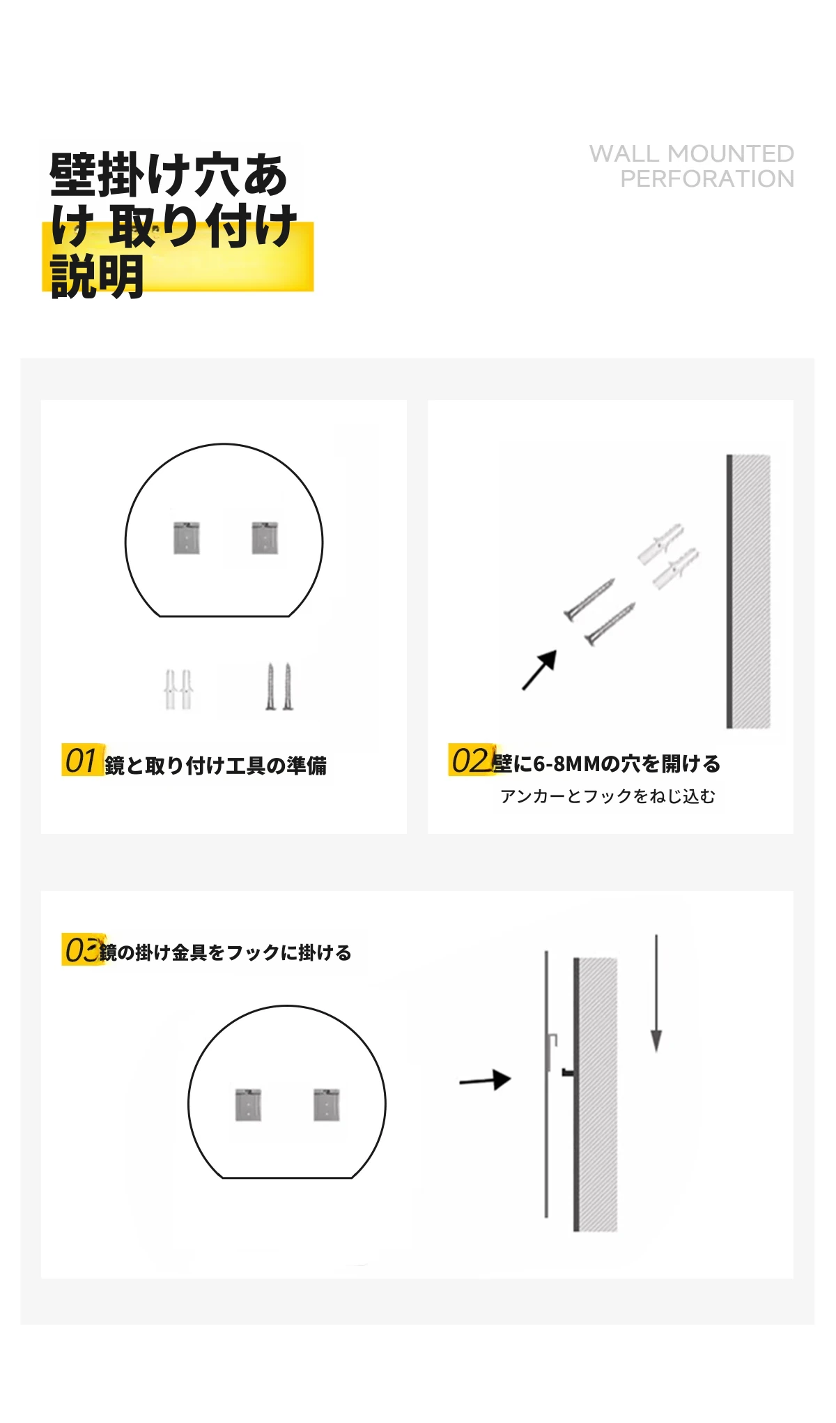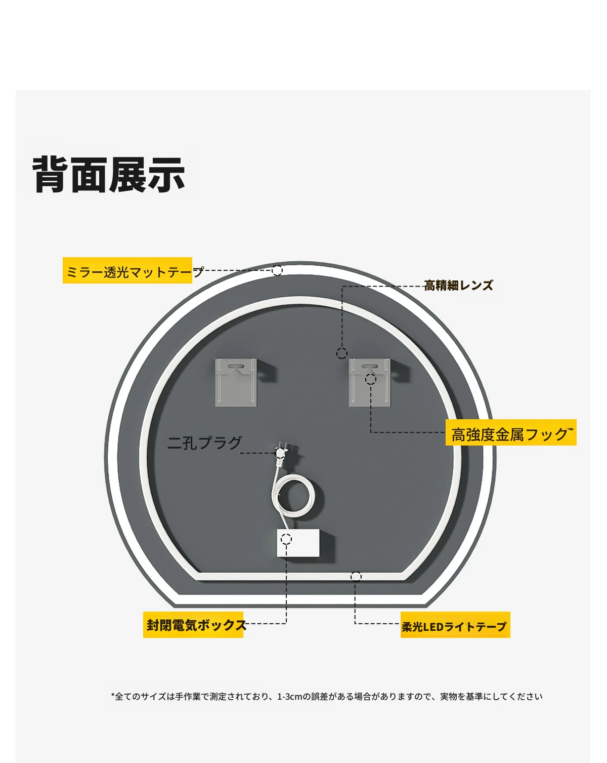 【ライトなし】60cm高解像度ミラー(穴あけ不要)