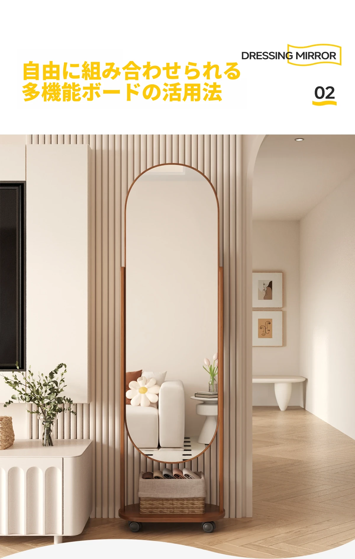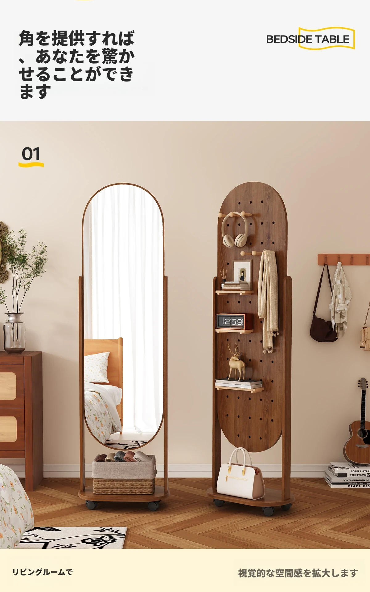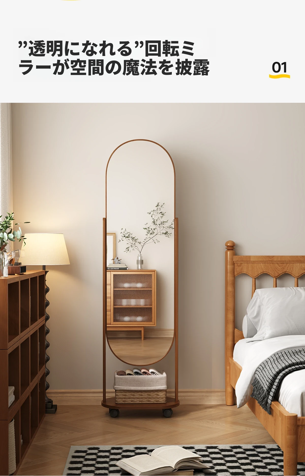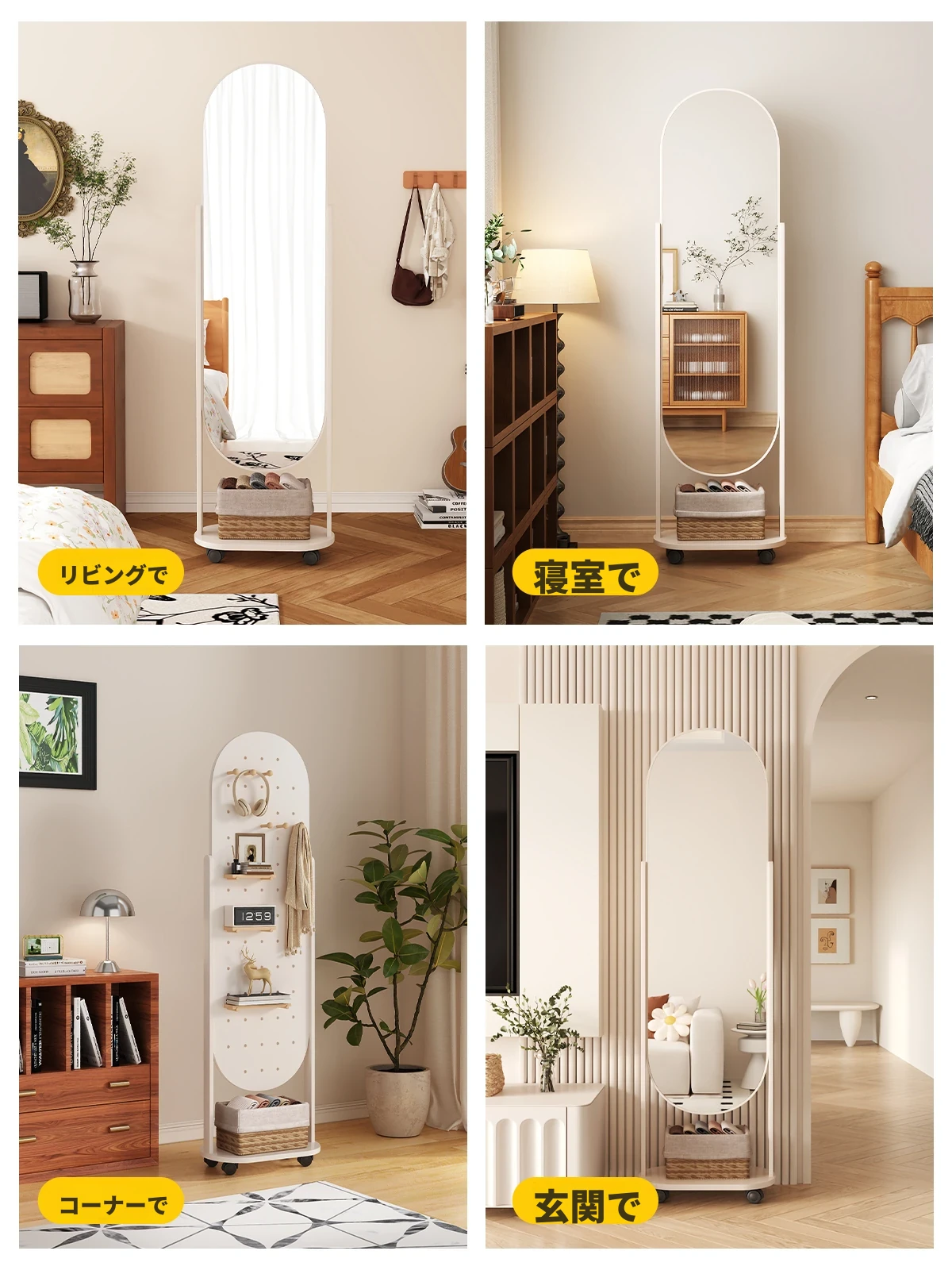 移動可能なドットボード全身鏡!衣類ハンガー付きのスタイリッシュな鏡で、あなたの寝室をおしゃれに演出。360度回転でどこでも試着可能、便利な衣服収納スペース付き!自宅で簡単にスタイリングを楽しもう!