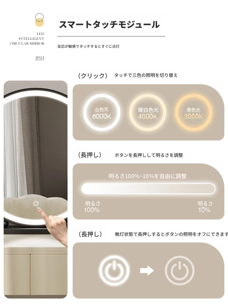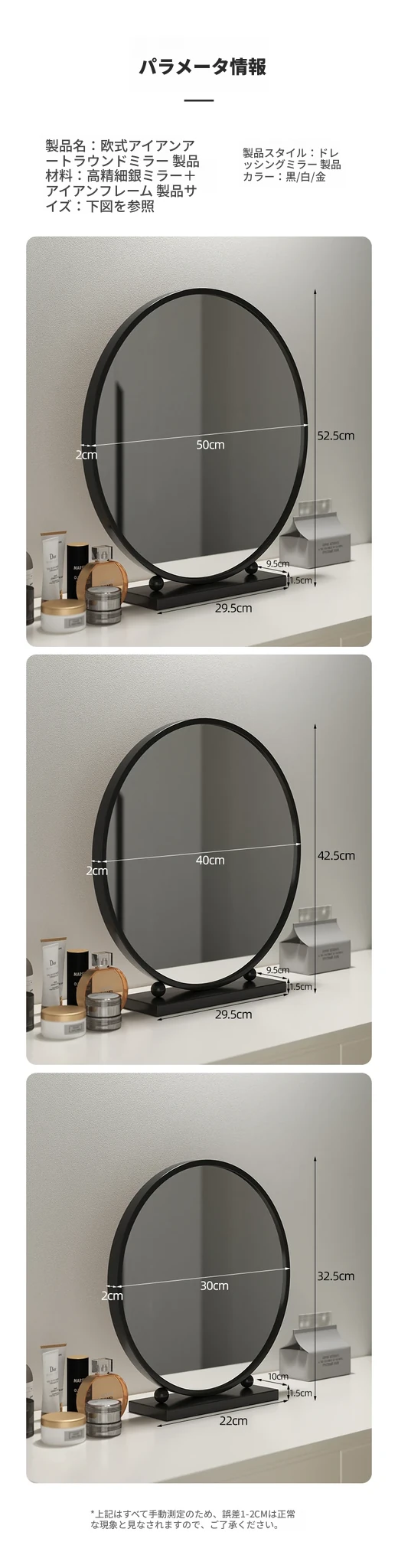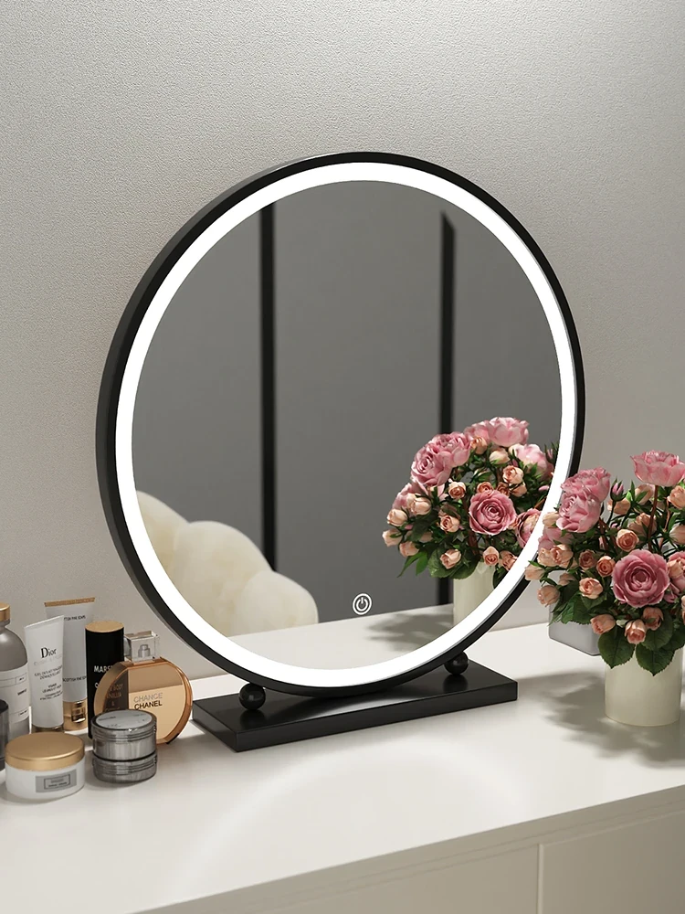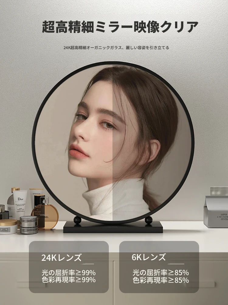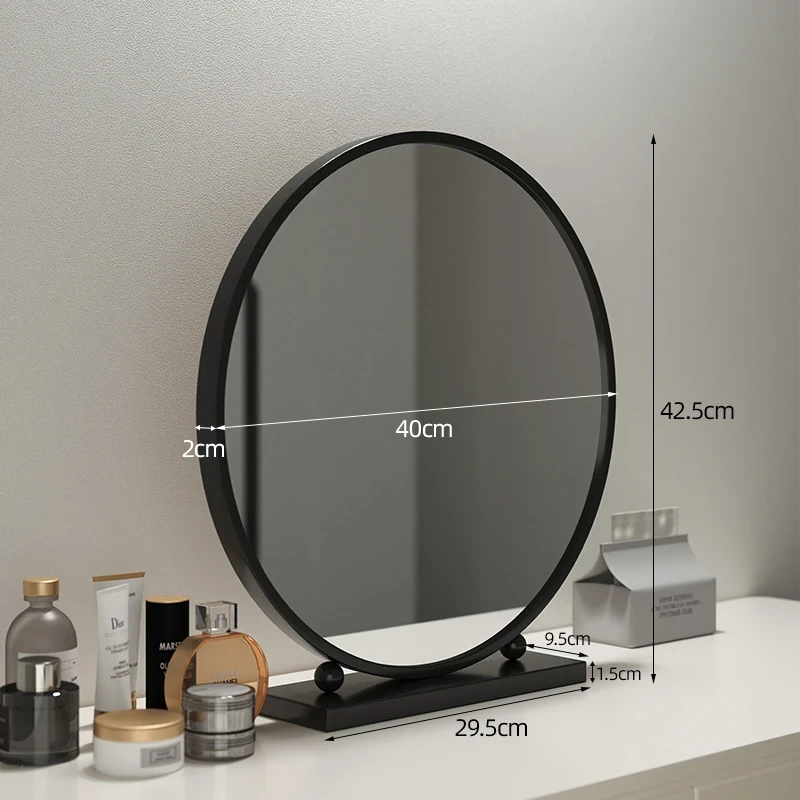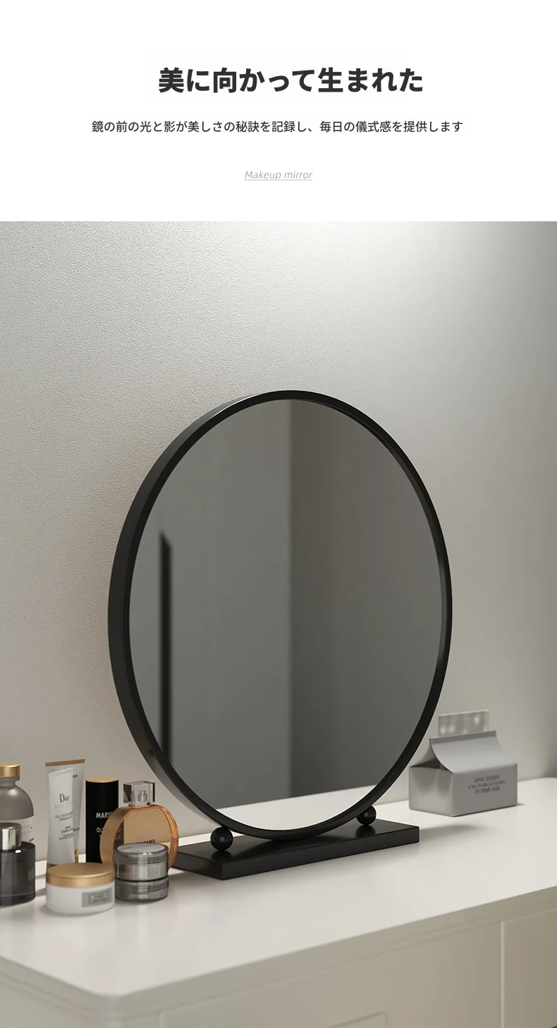 シンプルでスタイリッシュな円形デスク用化粧鏡 - 高級アイアン製、スマートなデザインのドレッサーミラー。寝室にぴったりの美しさを引き立てるアイテム!