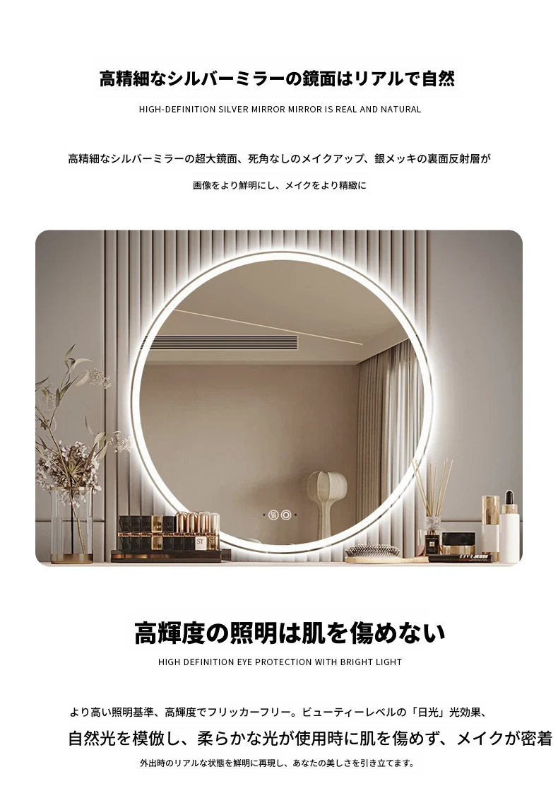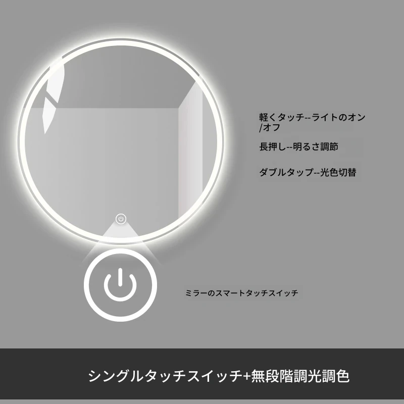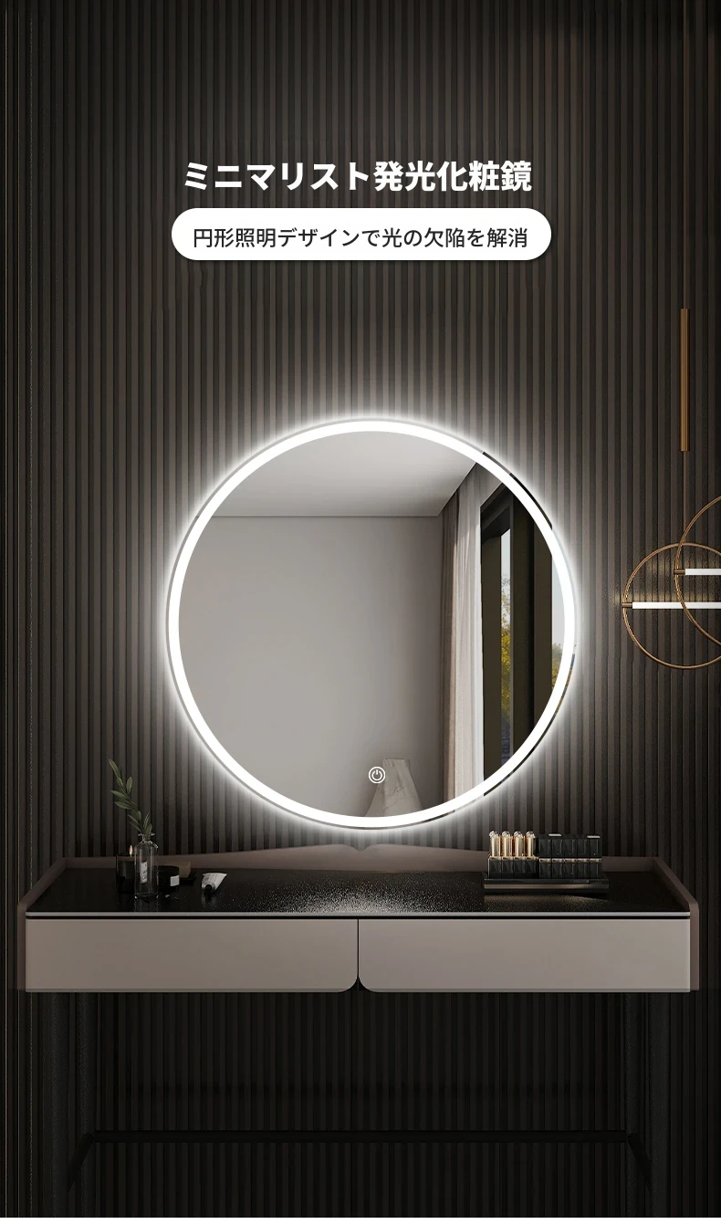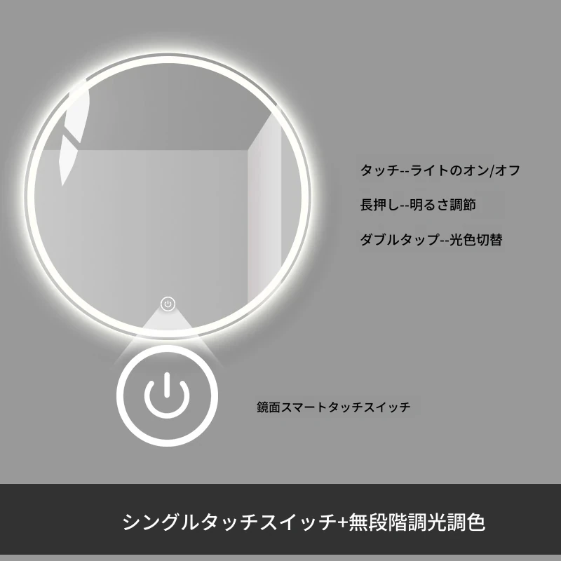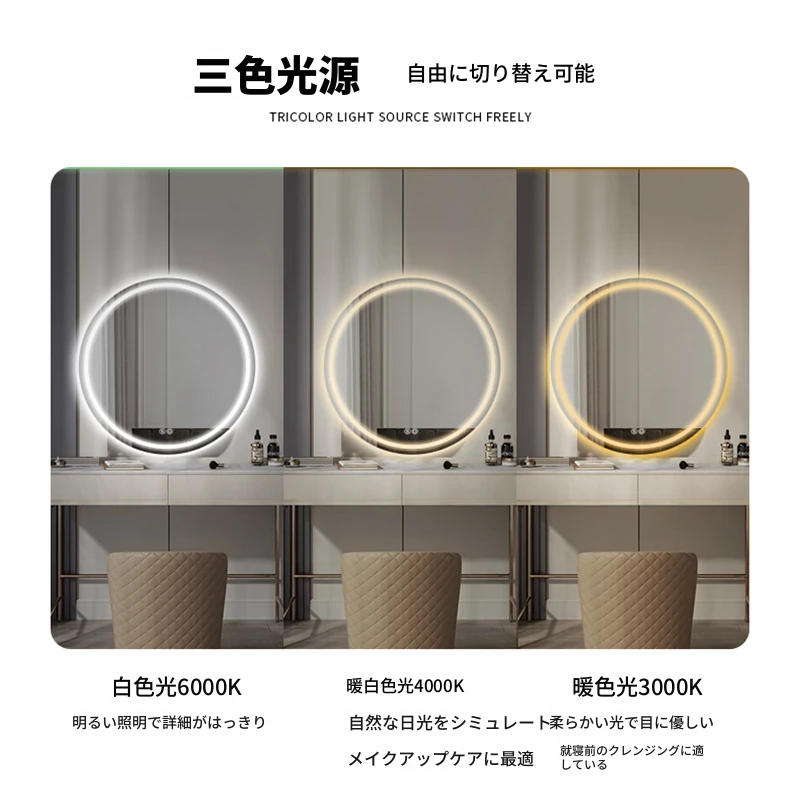 スマートタッチスクリーンLED照明付き壁掛け化粧鏡 - おしゃれなラウンドデザインのドレッシングミラーで、主寝室を華やかに演出!お手入れしやすく、明るさ調節も可能です。