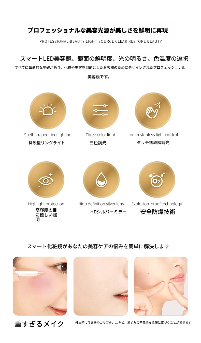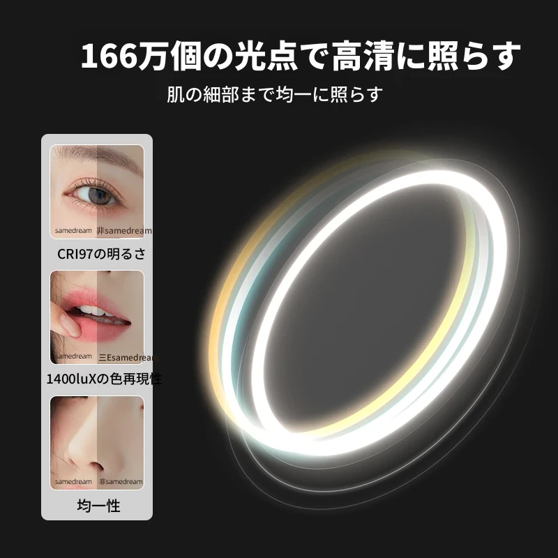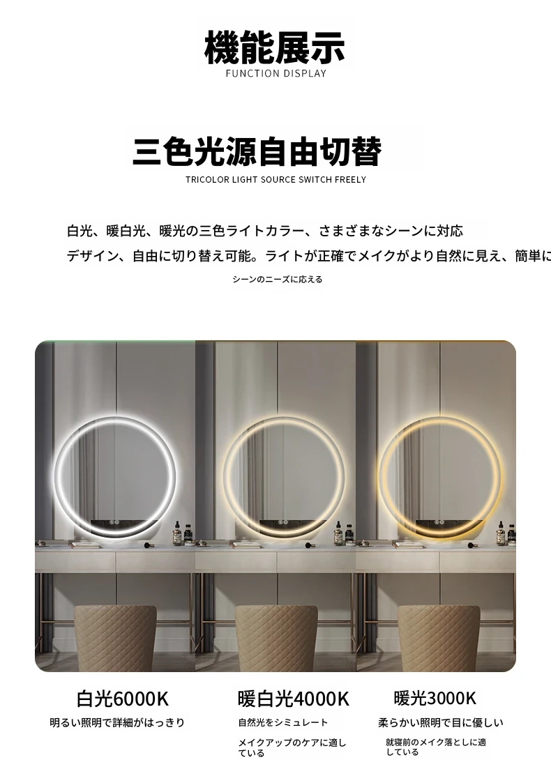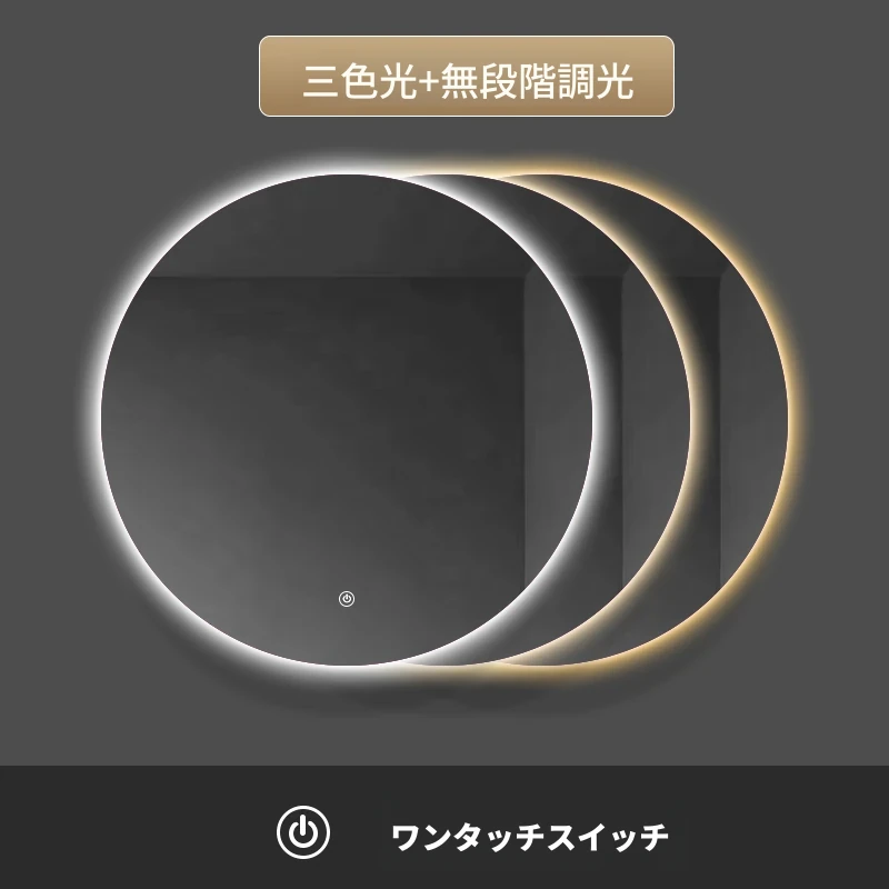 スマートタッチスクリーンLED照明付き壁掛け化粧鏡 - おしゃれなラウンドデザインのドレッシングミラーで、主寝室を華やかに演出!お手入れしやすく、明るさ調節も可能です。